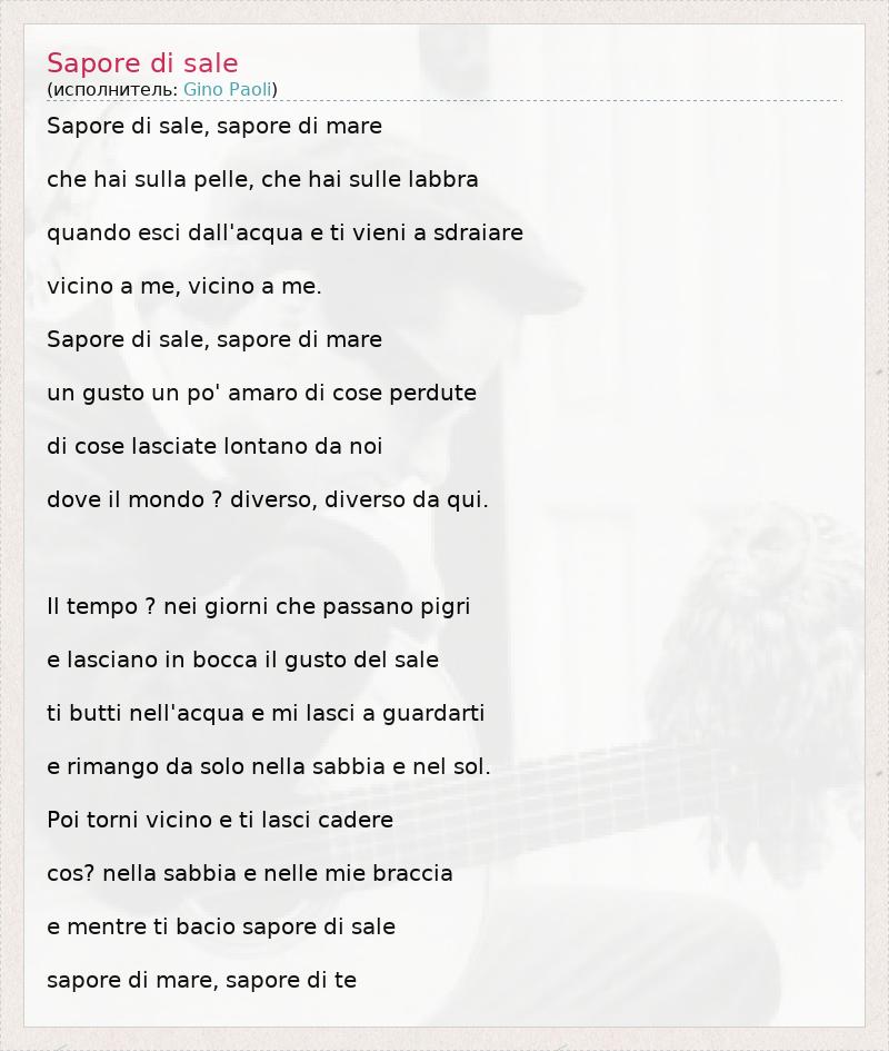 Sapore di sale, sapore di mare che hai sulla pelle, che hai sulle labbra quando esci dall'acqua e ti vieni a sdraiare vicino a me, vicino a me. Sapore di sale, sapore di mare un gusto un po' amaro di cose perdute di cose lasciate lontano da noi dove il mondo ? diverso, diverso da qui. Il tempo ? nei giorni che passano pigri e lasciano in bocca il gusto del sale ti butti nell'acqua e mi lasci a guardarti e rimango da solo nella sabbia e nel sol. Poi torni vicino e ti lasci cadere cos? nella sabbia e nelle mie braccia e mentre ti bacio sapore di sale sapore di mare, sapore di te