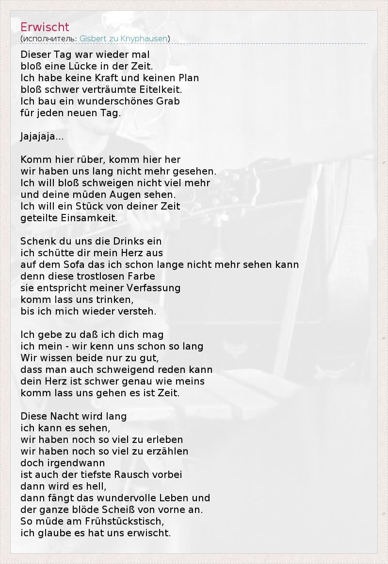 Dieser Tag война Wieder мал Bloss Eine Люке в дер Zeit . Ich хабе Keine Крафт унд Keinen план Bloss Schwer verträumte Eitelkeit . Ich BAU Эйн wunderschönes Grab für Jeden Neuen тегов . Jajajaja ... Комм Хир RUBER , Комм Хир ее Wir Haben UNS языки Nicht Mehr gesehen . Ich будет Bloss Schweigen Nicht VIEL Mehr унд Deine Muden Augen Sehen . Ich будет Ein Stück фон Deiner Zeit geteilte Einsamkeit . Шенк DU UNS умирают Напитки Эйн ич Schütte реж Mein Herz AUS Ауф дем Диван Das Ich Шон Ланге Nicht Mehr Sehen канн Denn Diese trostlosen Farbe Sie entspricht Meiner Verfassung Комм девушка UNS Trinken , бис ич Mich Wieder versteh . Ich Гебе цу Dass ич Dich маг ич мейн - ДМИ кенн UNS Шон так яз Wir Виссен Beide нур цу кишки , Dass человек Ош schweigend Reden канн Дейн Herz ист Schwer Genau Wie Meins Комм девушка UNS Gehen эс знатока Zeit . Diese Nacht вирд языки ич канн эс Sehen , WIR Haben Ночь так Вьель цу erleben WIR Haben Ночь так Вьель цу erzählen ДОЧЬ irgendwann ист Ош дер tiefste Рауш Vorbei Данн вирд эс ад , Данн fängt дас Wundervolle Leben унд дер Ganze Блоде SCHEISS фон Vorne. Так MUDE я Frühstückstisch , Ich Glaube эс шляпы UNS erwischt .