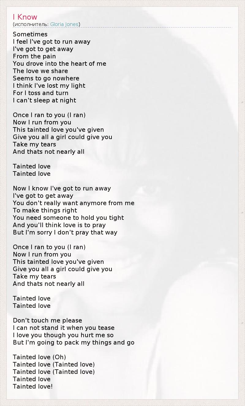Sometimes I feel I've got to run away I've got to get away From the pain You drove into the heart of me The love we share Seems to go nowhere I think I've lost my light For I toss and turn I can't sleep at night Once I ran to you (I ran) Now I run from you This tainted love you've given Give you all a girl could give you Take my tears And thats not nearly all Tainted love Tainted love Now I know I've got to run away I've got to get away You don't really want anymore from me To make things right You need someone to hold you tight And you'll think love is to pray But I'm sorry I don't pray that way Once I ran to you (I ran) Now I run from you This tainted love you've given Give you all a girl could give you Take my tears And thats not nearly all Tainted love Tainted love Don't touch me please I can not stand it when you tease I love you though you hurt me so But I'm going to pack my things and go Tainted love (Oh) Tainted love (Tainted love) Tainted love (Tainted love) Tainted love Tainted love!