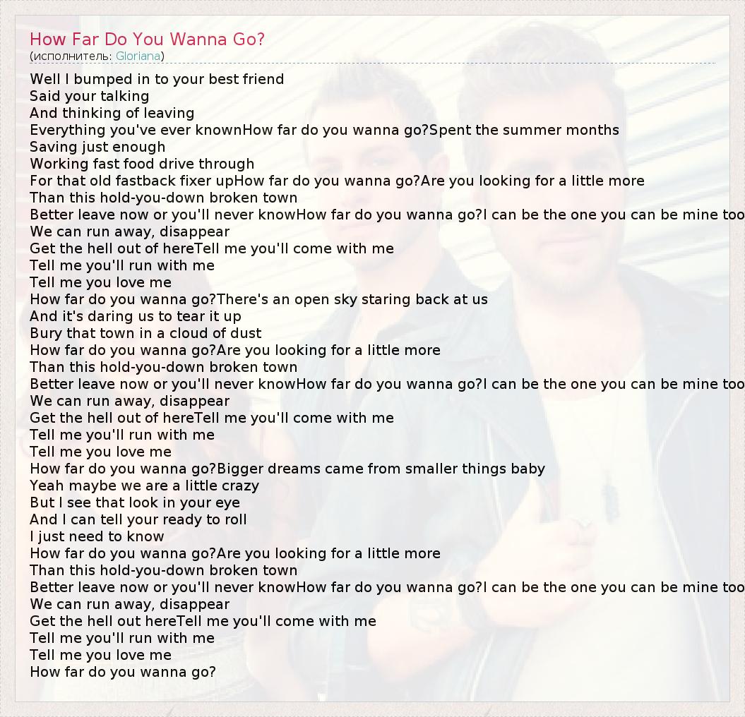 Well I bumped in to your best friend Said your talking And thinking of leaving Everything you've ever knownHow far do you wanna go?Spent the summer months Saving just enough Working fast food drive through For that old fastback fixer upHow far do you wanna go?Are you looking for a little more Than this hold-you-down broken town Better leave now or you'll never knowHow far do you wanna go?I can be the one you can be mine too We can run away, disappear Get the hell out of hereTell me you'll come with me Tell me you'll run with me Tell me you love me How far do you wanna go?There's an open sky staring back at us And it's daring us to tear it up Bury that town in a cloud of dust How far do you wanna go?Are you looking for a little more Than this hold-you-down broken town Better leave now or you'll never knowHow far do you wanna go?I can be the one you can be mine too We can run away, disappear Get the hell out of hereTell me you'll come with me Tell me you'll run with me Tell me you love me How far do you wanna go?Bigger dreams came from smaller things baby Yeah maybe we are a little crazy But I see that look in your eye And I can tell your ready to roll I just need to know How far do you wanna go?Are you looking for a little more Than this hold-you-down broken town Better leave now or you'll never knowHow far do you wanna go?I can be the one you can be mine too We can run away, disappear Get the hell out hereTell me you'll come with me Tell me you'll run with me Tell me you love me How far do you wanna go?