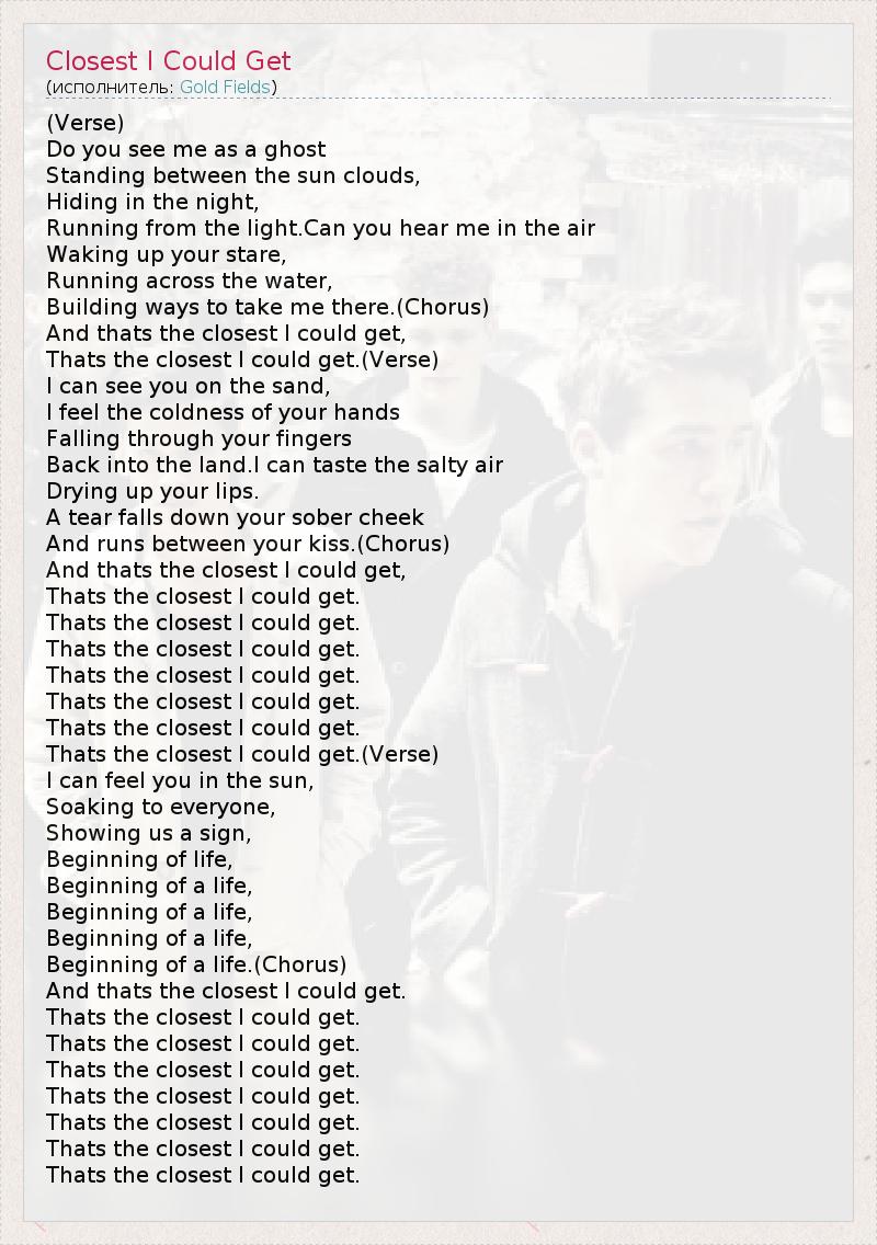 (Verse) Do you see me as a ghost Standing between the sun clouds, Hiding in the night, Running from the light.Can you hear me in the air Waking up your stare, Running across the water, Building ways to take me there.(Chorus) And thats the closest I could get, Thats the closest I could get.(Verse) I can see you on the sand, I feel the coldness of your hands Falling through your fingers Back into the land.I can taste the salty air Drying up your lips. A tear falls down your sober cheek And runs between your kiss.(Chorus) And thats the closest I could get, Thats the closest I could get. Thats the closest I could get. Thats the closest I could get. Thats the closest I could get. Thats the closest I could get. Thats the closest I could get. Thats the closest I could get.(Verse) I can feel you in the sun, Soaking to everyone, Showing us a sign, Beginning of life, Beginning of a life, Beginning of a life, Beginning of a life, Beginning of a life.(Chorus) And thats the closest I could get. Thats the closest I could get. Thats the closest I could get. Thats the closest I could get. Thats the closest I could get. Thats the closest I could get. Thats the closest I could get. Thats the closest I could get.