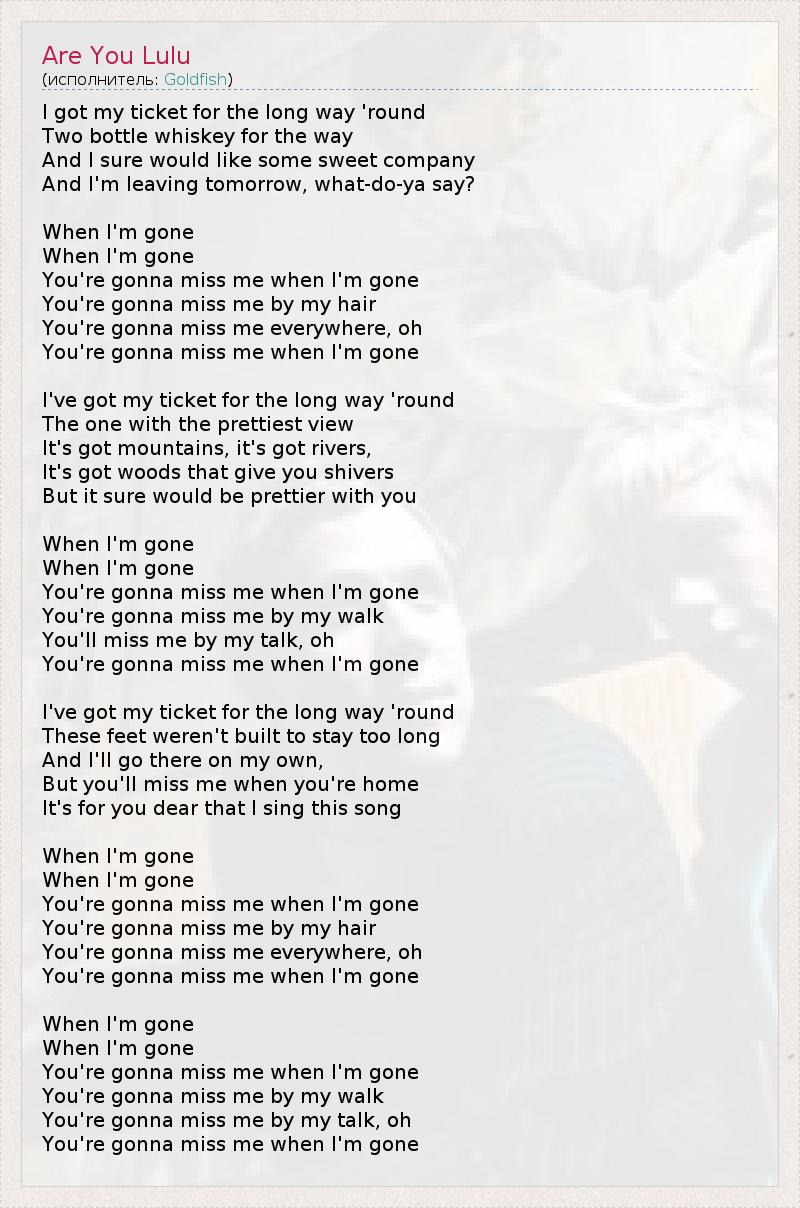 Я купила билет в дальний путь И две бутылки виски в дорогу, Конечно, я бы не отказалась от хорошей компании, Я уезжаю завтра, что скажешь? Когда я уеду, Когда я уеду, Ты будешь скучать по мне, когда я уеду, Ты будешь скучать по моим волосам, Ты будешь скучать по мне везде, о, Ты будешь скучать по мне, когда я уеду! Я купила билет в дальний путь, В котором я столько всего увижу: Горы, реки, Такие леса, от которых мурашки по коже, Но с тобою всё это заиграло бы новыми красками. Когда я уеду, Когда я уеду, Ты будешь скучать по мне, когда я уеду, Ты будешь скучать по моей походке, Ты будешь скучать по моей речи, Ты будешь скучать по мне, когда я уеду! Я купила билет в дальний путь, Я рождена такой, что не могу стоять на одном месте, И поеду туда одна, Но тебе будет не хватать меня, Эта песня для тебя, любимый. Когда я уеду, Когда я уеду, Ты будешь скучать по мне, когда я уеду, Ты будешь скучать по моим волосам, Ты будешь скучать по мне везде, о, Ты будешь скучать по мне, когда я уеду! Когда я уеду, Когда я уеду, Ты будешь скучать по мне, когда я уеду, Ты будешь скучать по моей походке, Ты будешь скучать по моей речи, Ты будешь скучать по мне, когда я уеду!