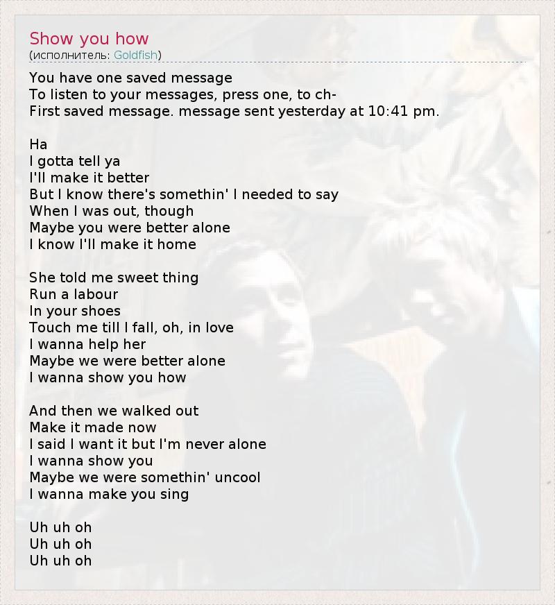 You have one saved message To listen to your messages, press one, to ch- First saved message. message sent yesterday at 10:41 pm. Ha I gotta tell ya I'll make it better But I know there's somethin' I needed to say When I was out, though Maybe you were better alone I know I'll make it home She told me sweet thing Run a labour In your shoes Touch me till I fall, oh, in love I wanna help her Maybe we were better alone I wanna show you how And then we walked out Make it made now I said I want it but I'm never alone I wanna show you Maybe we were somethin' uncool I wanna make you sing Uh uh oh Uh uh oh Uh uh oh