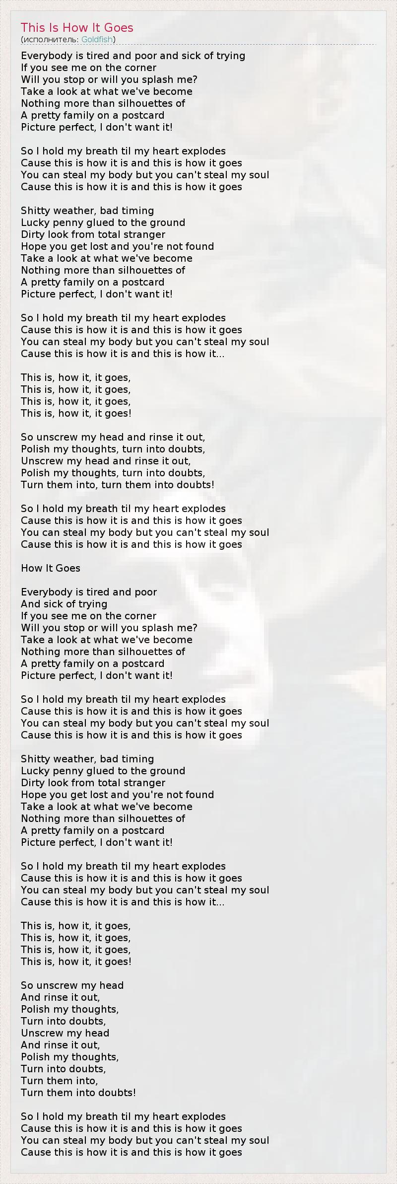 Everybody is tired and poor and sick of trying If you see me on the corner Will you stop or will you splash me? Take a look at what we've become Nothing more than silhouettes of A pretty family on a postcard Picture perfect, I don't want it! So I hold my breath til my heart explodes Cause this is how it is and this is how it goes You can steal my body but you can't steal my soul Cause this is how it is and this is how it goes Shitty weather, bad timing Lucky penny glued to the ground Dirty look from total stranger Hope you get lost and you're not found Take a look at what we've become Nothing more than silhouettes of A pretty family on a postcard Picture perfect, I don't want it! So I hold my breath til my heart explodes Cause this is how it is and this is how it goes You can steal my body but you can't steal my soul Cause this is how it is and this is how it... This is, how it, it goes, This is, how it, it goes, This is, how it, it goes, This is, how it, it goes! So unscrew my head and rinse it out, Polish my thoughts, turn into doubts, Unscrew my head and rinse it out, Polish my thoughts, turn into doubts, Turn them into, turn them into doubts! So I hold my breath til my heart explodes Cause this is how it is and this is how it goes You can steal my body but you can't steal my soul Cause this is how it is and this is how it goes How It Goes Everybody is tired and poor And sick of trying If you see me on the corner Will you stop or will you splash me? Take a look at what we've become Nothing more than silhouettes of A pretty family on a postcard Picture perfect, I don't want it! So I hold my breath til my heart explodes Cause this is how it is and this is how it goes You can steal my body but you can't steal my soul Cause this is how it is and this is how it goes Shitty weather, bad timing Lucky penny glued to the ground Dirty look from total stranger Hope you get lost and you're not found Take a look at what we've become Nothing more than silhouettes of A pretty family on a postcard Picture perfect, I don't want it! So I hold my breath til my heart explodes Cause this is how it is and this is how it goes You can steal my body but you can't steal my soul Cause this is how it is and this is how it... This is, how it, it goes, This is, how it, it goes, This is, how it, it goes, This is, how it, it goes! So unscrew my head And rinse it out, Polish my thoughts, Turn into doubts, Unscrew my head And rinse it out, Polish my thoughts, Turn into doubts, Turn them into, Turn them into doubts! So I hold my breath til my heart explodes Cause this is how it is and this is how it goes You can steal my body but you can't steal my soul Cause this is how it is and this is how it goes
