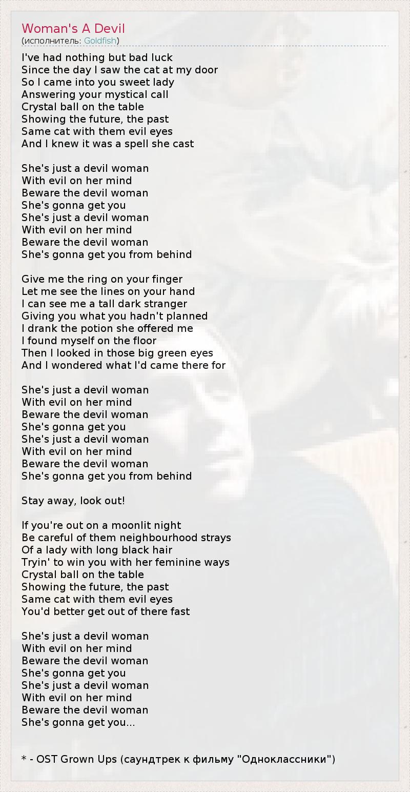 I've had nothing but bad luck Since the day I saw the cat at my door So I came into you sweet lady Answering your mystical call Crystal ball on the table Showing the future, the past Same cat with them evil eyes And I knew it was a spell she cast She's just a devil woman With evil on her mind Beware the devil woman She's gonna get you She's just a devil woman With evil on her mind Beware the devil woman She's gonna get you from behind Give me the ring on your finger Let me see the lines on your hand I can see me a tall dark stranger Giving you what you hadn't planned I drank the potion she offered me I found myself on the floor Then I looked in those big green eyes And I wondered what I'd came there for She's just a devil woman With evil on her mind Beware the devil woman She's gonna get you She's just a devil woman With evil on her mind Beware the devil woman She's gonna get you from behind Stay away, look out! If you're out on a moonlit night Be careful of them neighbourhood strays Of a lady with long black hair Tryin' to win you with her feminine ways Crystal ball on the table Showing the future, the past Same cat with them evil eyes You'd better get out of there fast She's just a devil woman With evil on her mind Beware the devil woman She's gonna get you She's just a devil woman With evil on her mind Beware the devil woman She's gonna get you... * - OST Grown Ups (саундтрек к фильму "Одноклассники")