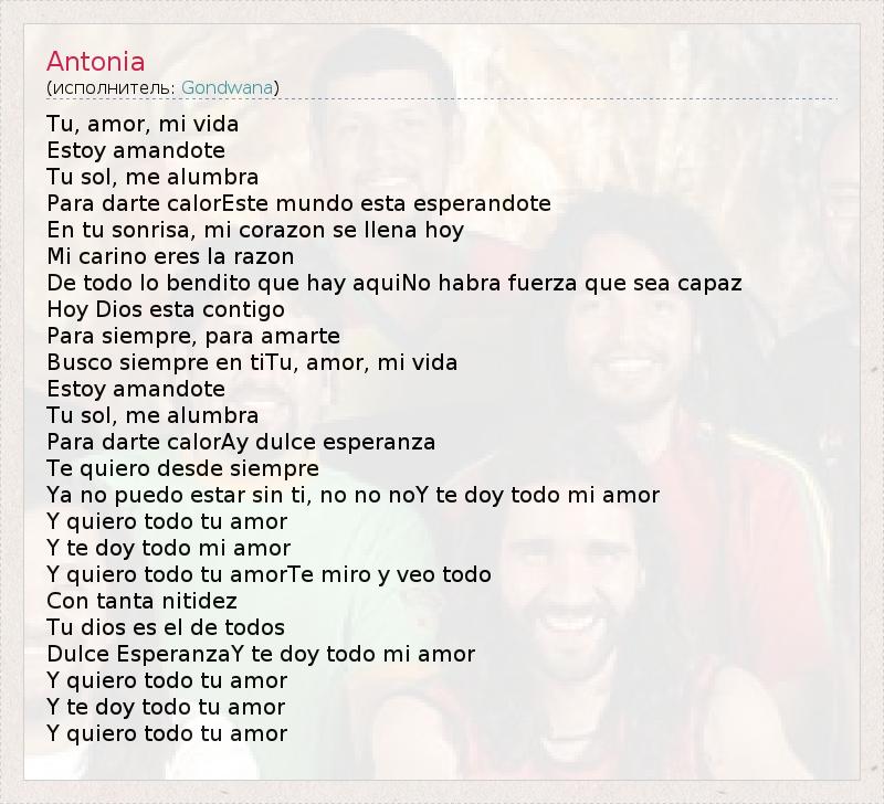 Tu, amor, mi vida Estoy amandote Tu sol, me alumbra Para darte calorEste mundo esta esperandote En tu sonrisa, mi corazon se llena hoy Mi carino eres la razon De todo lo bendito que hay aquiNo habra fuerza que sea capaz Hoy Dios esta contigo Para siempre, para amarte Busco siempre en tiTu, amor, mi vida Estoy amandote Tu sol, me alumbra Para darte calorAy dulce esperanza Te quiero desde siempre Ya no puedo estar sin ti, no no noY te doy todo mi amor Y quiero todo tu amor Y te doy todo mi amor Y quiero todo tu amorTe miro y veo todo Con tanta nitidez Tu dios es el de todos Dulce EsperanzaY te doy todo mi amor Y quiero todo tu amor Y te doy todo tu amor Y quiero todo tu amor