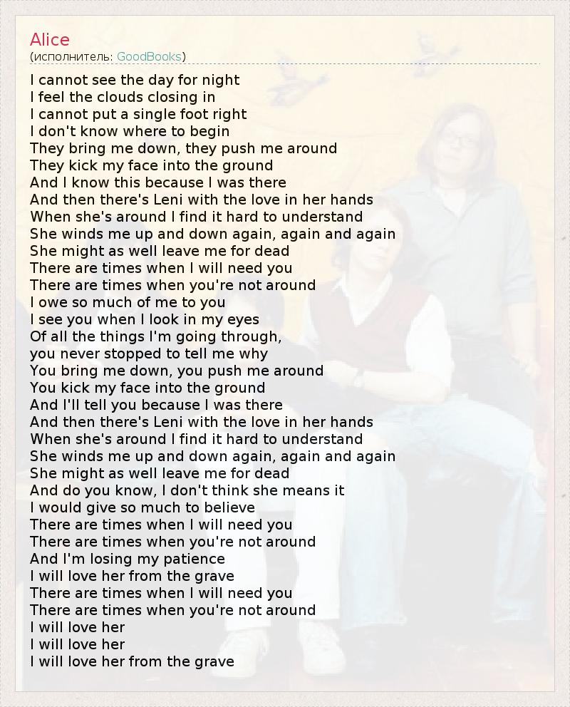 I cannot see the day for night I feel the clouds closing in I cannot put a single foot right I don't know where to begin They bring me down, they push me around They kick my face into the ground And I know this because I was there And then there's Leni with the love in her hands When she's around I find it hard to understand She winds me up and down again, again and again She might as well leave me for dead There are times when I will need you There are times when you're not around I owe so much of me to you I see you when I look in my eyes Of all the things I'm going through, you never stopped to tell me why You bring me down, you push me around You kick my face into the ground And I'll tell you because I was there And then there's Leni with the love in her hands When she's around I find it hard to understand She winds me up and down again, again and again She might as well leave me for dead And do you know, I don't think she means it I would give so much to believe There are times when I will need you There are times when you're not around And I'm losing my patience I will love her from the grave There are times when I will need you There are times when you're not around I will love her I will love her I will love her from the grave