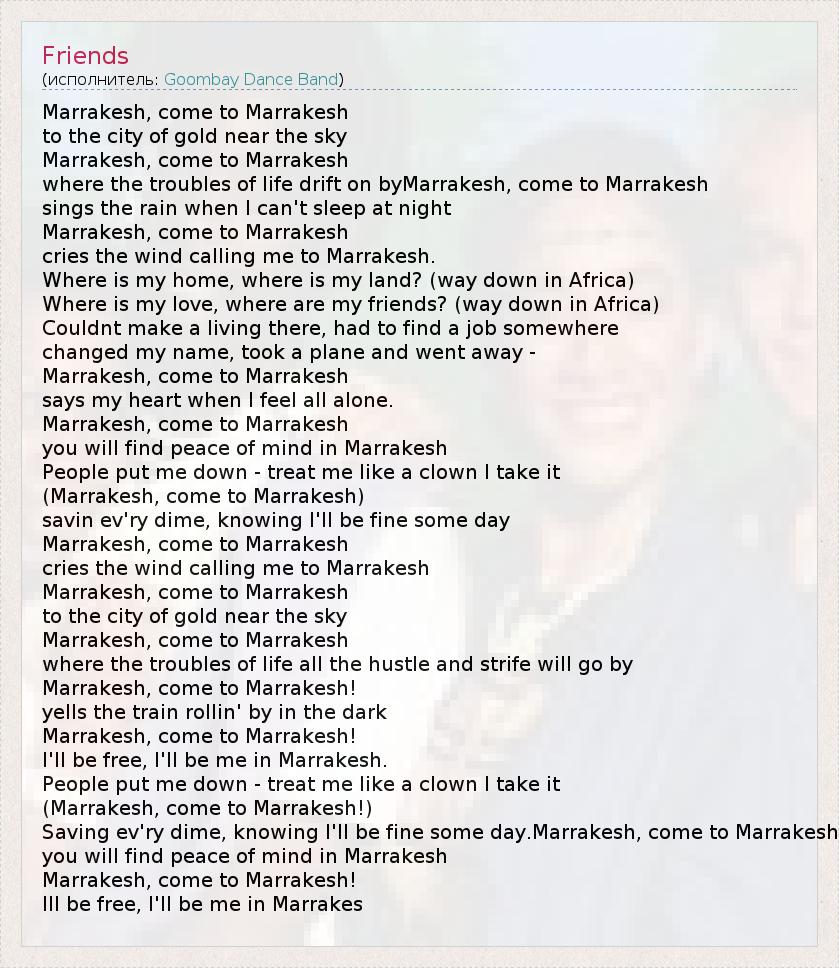 Saving ev'ry dime, knowing I'll be fine some day.Marrakesh, come to Marrakesh