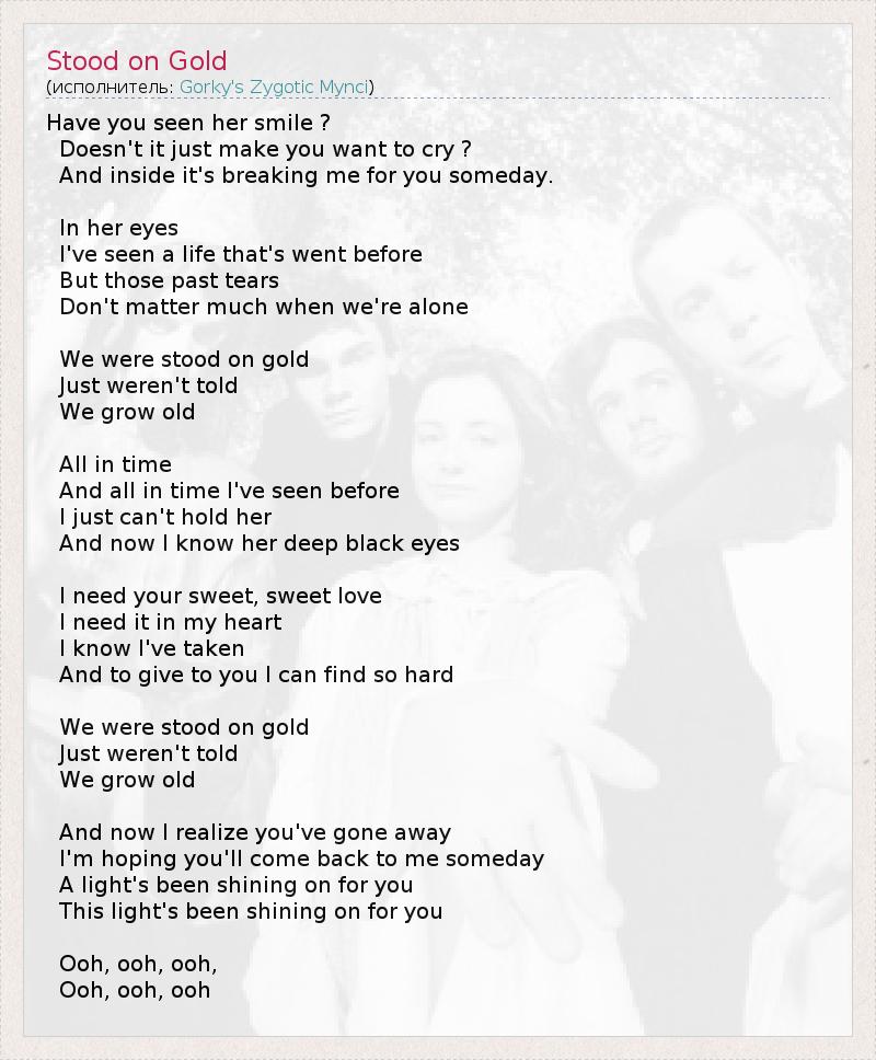 Have you seen her smile ? Doesn't it just make you want to cry ? And inside it's breaking me for you someday. In her eyes I've seen a life that's went before But those past tears Don't matter much when we're alone We were stood on gold Just weren't told We grow old All in time And all in time I've seen before I just can't hold her And now I know her deep black eyes I need your sweet, sweet love I need it in my heart I know I've taken And to give to you I can find so hard We were stood on gold Just weren't told We grow old And now I realize you've gone away I'm hoping you'll come back to me someday A light's been shining on for you This light's been shining on for you Ooh, ooh, ooh, Ooh, ooh, ooh