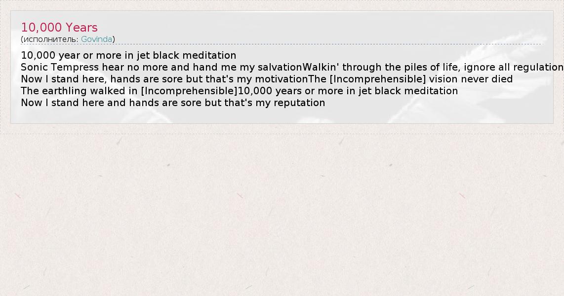 10,000 year or more in jet black meditation Sonic Tempress hear no more and hand me my salvationWalkin' through the piles of life, ignore all regulation Now I stand here, hands are sore but that's my motivationThe [Incomprehensible] vision never died The earthling walked in [Incomprehensible]10,000 years or more in jet black meditation Now I stand here and hands are sore but that's my reputation