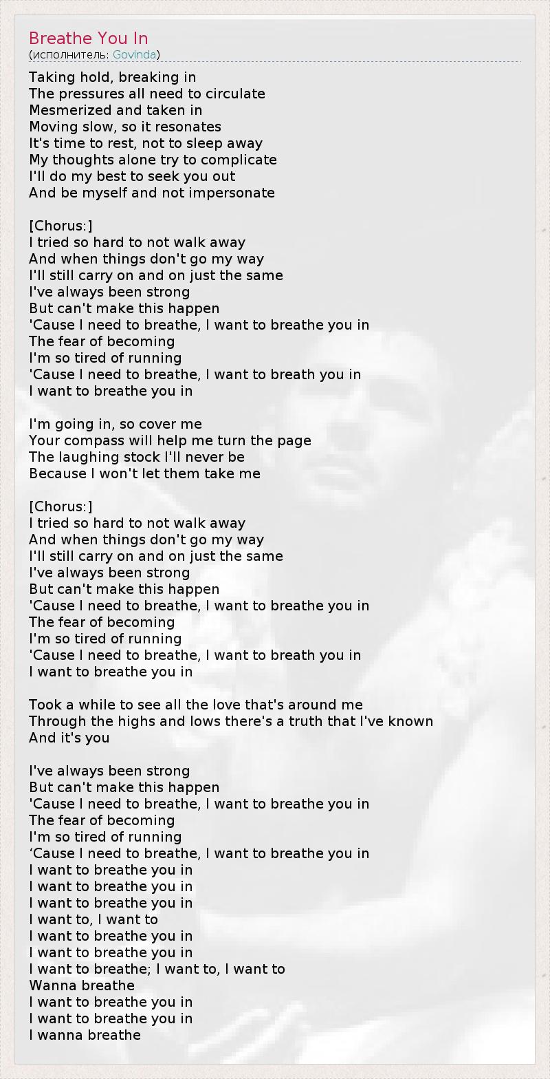 Завладевая мной, врываясь внутрь, Напряжение ищет пространство для циркуляции. Очарованный и поглощённый своими ощущениями, Я медленно двигаюсь, и они усиливаются. Пора бы отдохнуть, но не проспать всё на свете. Сами по себе мои мысли пытаются всё усложнить. Я сделаю всё возможное, чтобы отыскать тебя И остаться самим собой, не подражая кому-либо... [Припев:] Я старался, как мог, избежать расставания. 1 Когда не выходит по-моему, Я всё же продолжаю в том же духе. Я всегда был сильным, Но я не могу позволить этому случиться, Потому что мне нужно дышать, я хочу дышать тобой. Страх перед грядущим - Я так устал бегать от него, Потому что мне нужно дышать, я хочу дышать тобой, Я хочу дышать тобой. Я вхожу, так что прикрой меня. Твой компас поможет мне перелистнуть страницу. Я никогда не буду посмешищем, Потому что я им не дамся. [Припев:] Я старался, как мог, избежать расставания. Когда не выходит по-моему, Я всё же продолжаю в том же духе. Я всегда был сильным, Но я не могу позволить этому случиться, Потому что мне нужно дышать, я хочу дышать тобой. Страх перед грядущим - Я так устал бегать от него, Потому что мне нужно дышать, я хочу дышать тобой, Я хочу дышать тобой. Потребовалось время, чтобы увидеть любовь, что окружает меня. Среди взлетов и падений есть истина, которую я знаю, И это ты. Я всегда был сильным, Но я не могу позволить этому случиться, Потому что мне нужно дышать, я хочу дышать тобой. Страх перед грядущим - Я так устал бегать от него, Потому что мне нужно дышать, Я хочу дышать тобой, Я хочу дышать тобой, Я хочу дышать тобой, Я хочу, я хочу, Я хочу дышать тобой, Я хочу дышать тобой, Я хочу дышать, я хочу, я хочу, Хочу дышать... Я хочу дышать тобой, Я хочу дышать тобой, Я хочу дышать. 1 - дословно: не уйти прочь