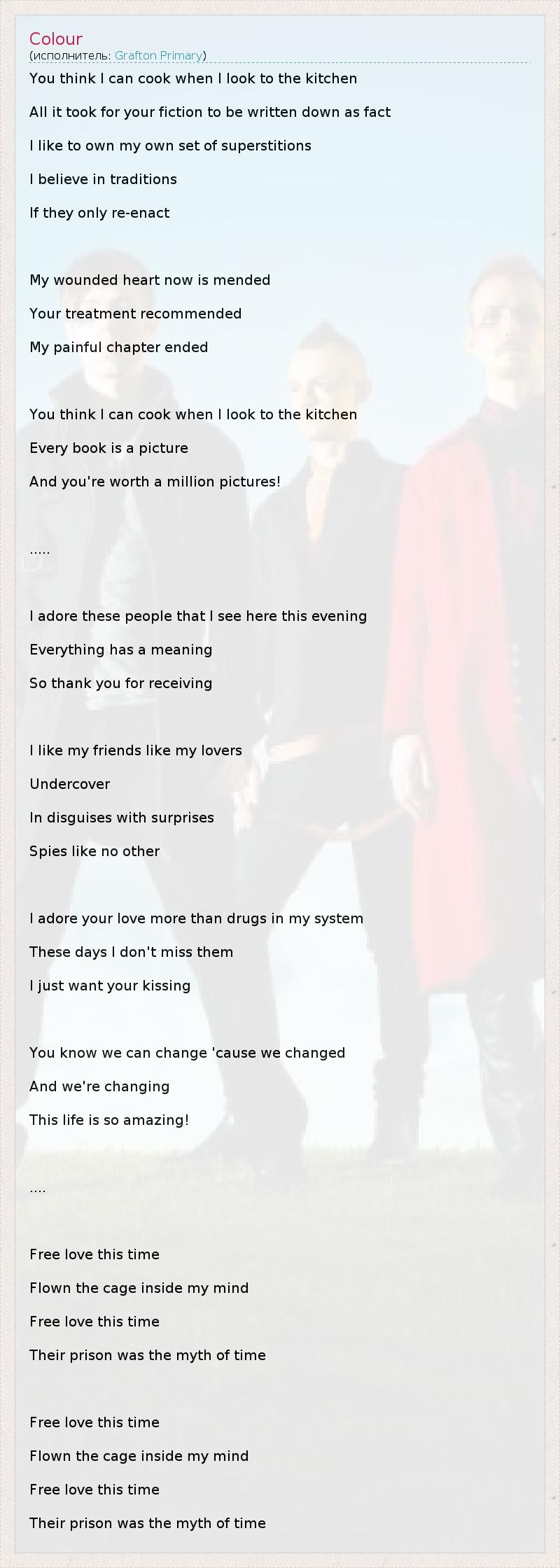 You think I can cook when I look to the kitchen All it took for your fiction to be written down as fact I like to own my own set of superstitions I believe in traditions If they only re-enact My wounded heart now is mended Your treatment recommended My painful chapter ended You think I can cook when I look to the kitchen Every book is a picture And you're worth a million pictures! ..... I adore these people that I see here this evening Everything has a meaning So thank you for receiving I like my friends like my lovers Undercover In disguises with surprises Spies like no other I adore your love more than drugs in my system These days I don't miss them I just want your kissing You know we can change 'cause we changed And we're changing This life is so amazing! .... Free love this time Flown the cage inside my mind Free love this time Their prison was the myth of time Free love this time Flown the cage inside my mind Free love this time Their prison was the myth of time