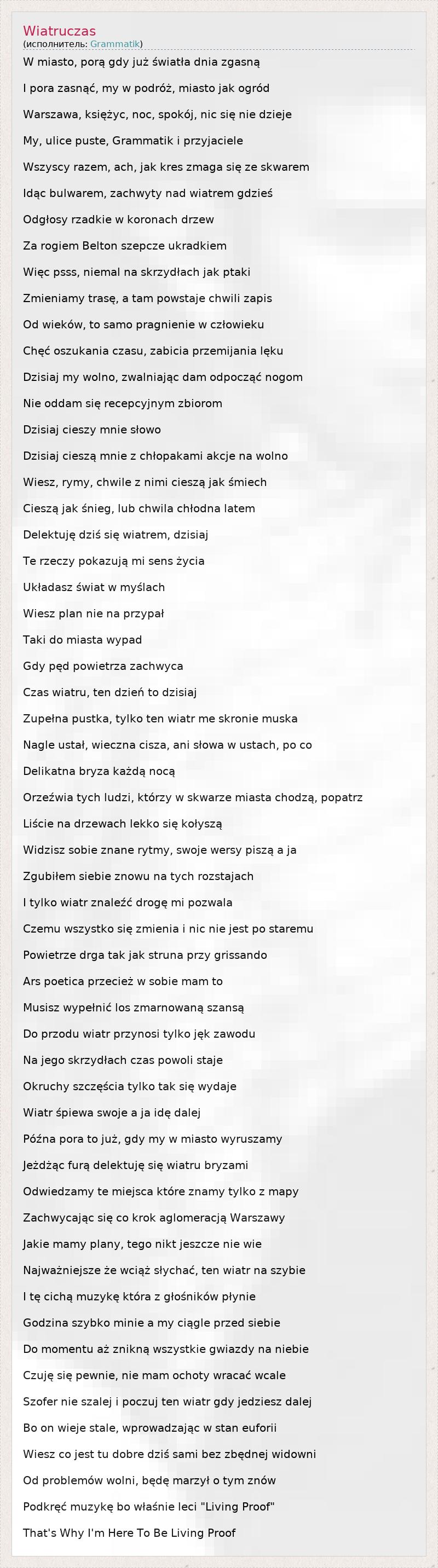 W miasto, porą gdy już światła dnia zgasną I pora zasnąć, my w podróż, miasto jak ogród Warszawa, księżyc, noc, spokój, nic się nie dzieje My, ulice puste, Grammatik i przyjaciele Wszyscy razem, ach, jak kres zmaga się ze skwarem Idąc bulwarem, zachwyty nad wiatrem gdzieś Odgłosy rzadkie w koronach drzew Za rogiem Belton szepcze ukradkiem Więc psss, niemal na skrzydłach jak ptaki Zmieniamy trasę, a tam powstaje chwili zapis Od wieków, to samo pragnienie w człowieku Chęć oszukania czasu, zabicia przemijania lęku Dzisiaj my wolno, zwalniając dam odpocząć nogom Nie oddam się recepcyjnym zbiorom Dzisiaj cieszy mnie słowo Dzisiaj cieszą mnie z chłopakami akcje na wolno Wiesz, rymy, chwile z nimi cieszą jak śmiech Cieszą jak śnieg, lub chwila chłodna latem Delektuję dziś się wiatrem, dzisiaj Te rzeczy pokazują mi sens życia Układasz świat w myślach Wiesz plan nie na przypał Taki do miasta wypad Gdy pęd powietrza zachwyca Czas wiatru, ten dzień to dzisiaj Zupełna pustka, tylko ten wiatr me skronie muska Nagle ustał, wieczna cisza, ani słowa w ustach, po co Delikatna bryza każdą nocą Orzeźwia tych ludzi, którzy w skwarze miasta chodzą, popatrz Liście na drzewach lekko się kołyszą Widzisz sobie znane rytmy, swoje wersy piszą a ja Zgubiłem siebie znowu na tych rozstajach I tylko wiatr znaleźć drogę mi pozwala Czemu wszystko się zmienia i nic nie jest po staremu Powietrze drga tak jak struna przy grissando Ars poetica przecież w sobie mam to Musisz wypełnić los zmarnowaną szansą Do przodu wiatr przynosi tylko jęk zawodu Na jego skrzydłach czas powoli staje Okruchy szczęścia tylko tak się wydaje Wiatr śpiewa swoje a ja idę dalej Późna pora to już, gdy my w miasto wyruszamy Jeżdżąc furą delektuję się wiatru bryzami Odwiedzamy te miejsca które znamy tylko z mapy Zachwycając się co krok aglomeracją Warszawy Jakie mamy plany, tego nikt jeszcze nie wie Najważniejsze że wciąż słychać, ten wiatr na szybie I tę cichą muzykę która z głośników płynie Godzina szybko minie a my ciągle przed siebie Do momentu aż znikną wszystkie gwiazdy na niebie Czuję się pewnie, nie mam ochoty wracać wcale Szofer nie szalej i poczuj ten wiatr gdy jedziesz dalej Bo on wieje stale, wprowadzając w stan euforii Wiesz co jest tu dobre dziś sami bez zbędnej widowni Od problemów wolni, będę marzył o tym znów Podkręć muzykę bo właśnie leci "Living Proof" That's Why I'm Here To Be Living Proof