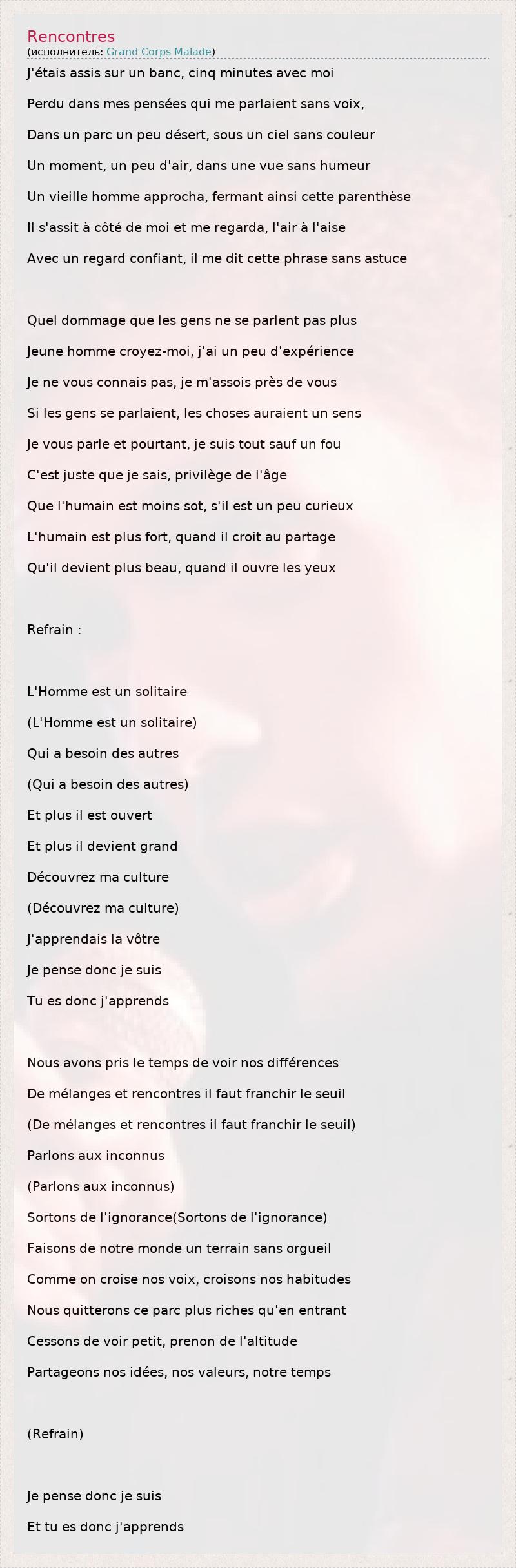 Это интересно:Grand Corps Malade, often abbreviated GCM, is the alias of slam poet Fabien Marsaud, born on July 31, 1977 in Le Blanc-Mesnil, Seine-Saint-Denis, France.On July 31, 1997, after a bad dive in a pool in Saint-Denis, Marsaud displaced his spine and was told he would never walk again. However, in 1999 after a year of treatment, he was able to walk again. The alias Grand Corps Malade (meaning "Tall Sick Body" in French) is a reference to his condition as well as his height (nearly 6'5").He made his first appearance in a bar in Paris on October 23, 2003, after which he started workshops to introduce youngsters in his community to slam poetry. Soon afterwards a friend of... продолжение