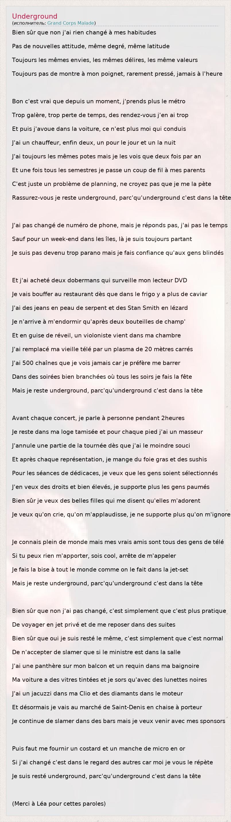 Это интересно:Grand Corps Malade, often abbreviated GCM, is the alias of slam poet Fabien Marsaud, born on July 31, 1977 in Le Blanc-Mesnil, Seine-Saint-Denis, France.On July 31, 1997, after a bad dive in a pool in Saint-Denis, Marsaud displaced his spine and was told he would never walk again. However, in 1999 after a year of treatment, he was able to walk again. The alias Grand Corps Malade (meaning "Tall Sick Body" in French) is a reference to his condition as well as his height (nearly 6'5").He made his first appearance in a bar in Paris on October 23, 2003, after which he started workshops to introduce youngsters in his community to slam poetry. Soon afterwards a friend of... продолжение