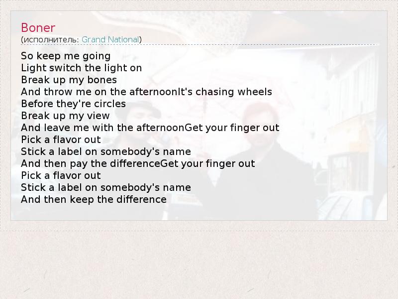 So keep me going Light switch the light on Break up my bones And throw me on the afternoonIt's chasing wheels Before they're circles Break up my view And leave me with the afternoonGet your finger out Pick a flavor out Stick a label on somebody's name And then pay the differenceGet your finger out Pick a flavor out Stick a label on somebody's name And then keep the difference