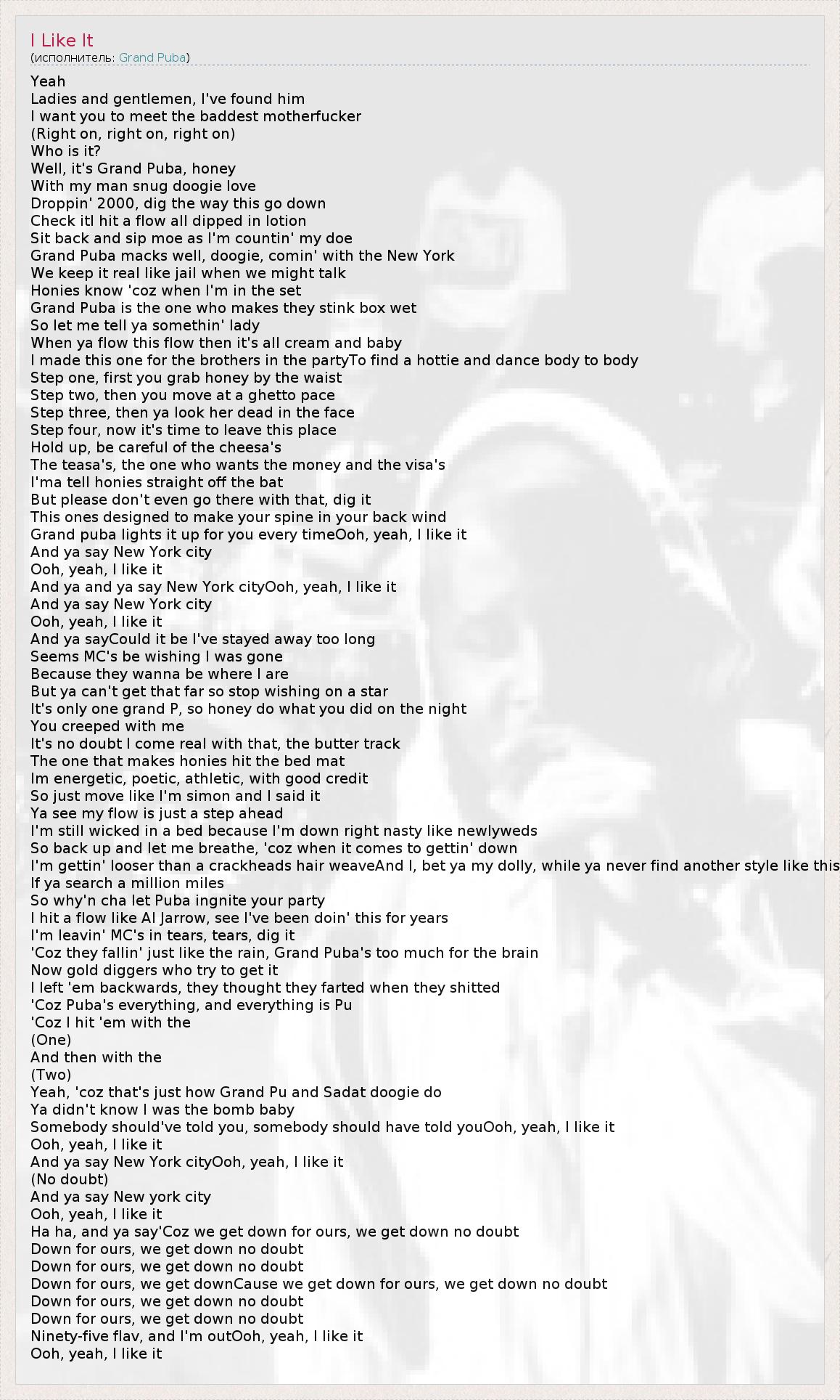 Yeah Ladies and gentlemen, I've found him I want you to meet the baddest motherfucker (Right on, right on, right on) Who is it? Well, it's Grand Puba, honey With my man snug doogie love Droppin' 2000, dig the way this go down Check itI hit a flow all dipped in lotion Sit back and sip moe as I'm countin' my doe Grand Puba macks well, doogie, comin' with the New York We keep it real like jail when we might talk Honies know 'coz when I'm in the set Grand Puba is the one who makes they stink box wet So let me tell ya somethin' lady When ya flow this flow then it's all cream and baby I made this one for the brothers in the partyTo find a hottie and dance body to body Step one, first you grab honey by the waist Step two, then you move at a ghetto pace Step three, then ya look her dead in the face Step four, now it's time to leave this place Hold up, be careful of the cheesa's The teasa's, the one who wants the money and the visa's I'ma tell honies straight off the bat But please don't even go there with that, dig it This ones designed to make your spine in your back wind Grand puba lights it up for you every timeOoh, yeah, I like it And ya say New York city Ooh, yeah, I like it And ya and ya say New York cityOoh, yeah, I like it And ya say New York city Ooh, yeah, I like it And ya sayCould it be I've stayed away too long Seems MC's be wishing I was gone Because they wanna be where I are But ya can't get that far so stop wishing on a star It's only one grand P, so honey do what you did on the night You creeped with me It's no doubt I come real with that, the butter track The one that makes honies hit the bed mat Im energetic, poetic, athletic, with good credit So just move like I'm simon and I said it Ya see my flow is just a step ahead I'm still wicked in a bed because I'm down right nasty like newlyweds So back up and let me breathe, 'coz when it comes to gettin' down I'm gettin' looser than a crackheads hair weaveAnd I, bet ya my dolly, while ya never find another style like this If ya search a million miles So why'n cha let Puba ingnite your party I hit a flow like Al Jarrow, see I've been doin' this for years I'm leavin' MC's in tears, tears, dig it 'Coz they fallin' just like the rain, Grand Puba's too much for the brain Now gold diggers who try to get it I left 'em backwards, they thought they farted when they shitted 'Coz Puba's everything, and everything is Pu 'Coz I hit 'em with the (One) And then with the (Two) Yeah, 'coz that's just how Grand Pu and Sadat doogie do Ya didn't know I was the bomb baby Somebody should've told you, somebody should have told youOoh, yeah, I like it Ooh, yeah, I like it And ya say New York cityOoh, yeah, I like it (No doubt) And ya say New york city Ooh, yeah, I like it Ha ha, and ya say'Coz we get down for ours, we get down no doubt Down for ours, we get down no doubt Down for ours, we get down no doubt Down for ours, we get downCause we get down for ours, we get down no doubt Down for ours, we get down no doubt Down for ours, we get down no doubt Ninety-five flav, and I'm outOoh, yeah, I like it Ooh, yeah, I like it