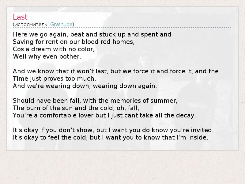 Here we go again, beat and stuck up and spent and Saving for rent on our blood red homes, Cos a dream with no color, Well why even bother. And we know that it won't last, but we force it and force it, and the Time just proves too much, And we're wearing down, wearing down again. Should have been fall, with the memories of summer, The burn of the sun and the cold, oh, fall, You're a comfortable lover but I just cant take all the decay. It's okay if you don't show, but I want you do know you're invited. It's okay to feel the cold, but I want you to know that I'm inside.