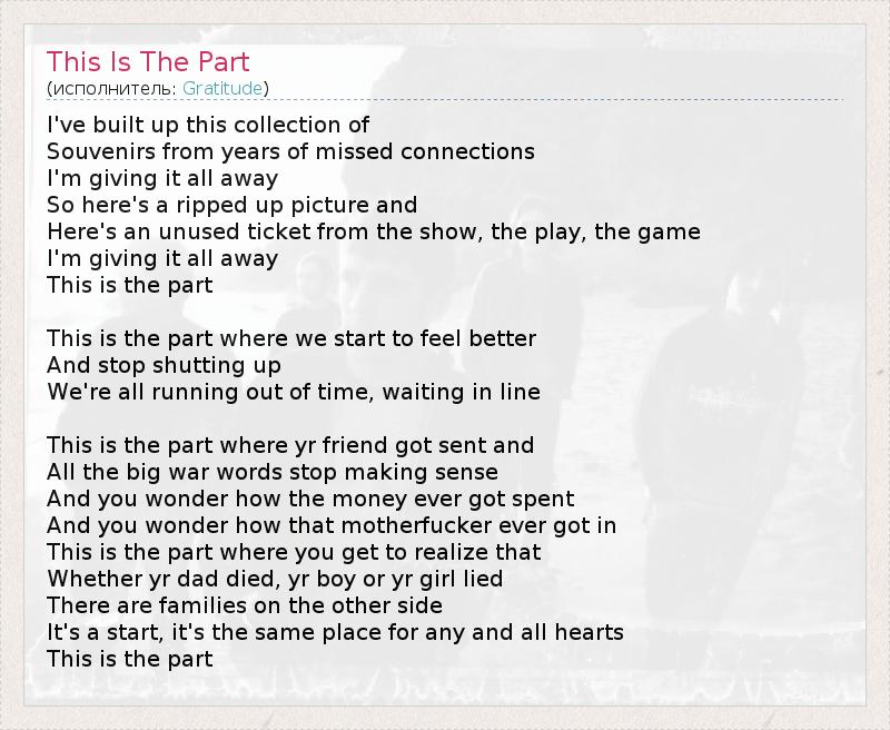 I've built up this collection of Souvenirs from years of missed connections I'm giving it all away So here's a ripped up picture and Here's an unused ticket from the show, the play, the game I'm giving it all away This is the part This is the part where we start to feel better And stop shutting up We're all running out of time, waiting in line This is the part where yr friend got sent and All the big war words stop making sense And you wonder how the money ever got spent And you wonder how that motherfucker ever got in This is the part where you get to realize that Whether yr dad died, yr boy or yr girl lied There are families on the other side It's a start, it's the same place for any and all hearts This is the part