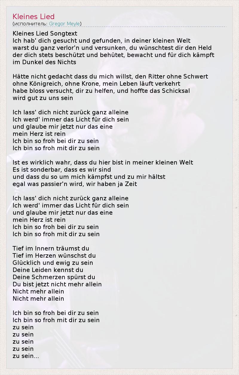 Малый Lied Songtext Ich Жил 'Dich gesucht унд gefunden, в Deiner Kleinen Welt warst дю Ганц verlor'n унд versunken, дю wünschtest реж ден, удерживаемые дер Dich Stets beschützt унд behütet, bewacht унд für Dich kämpft им Dunkel де Nichts Hätte Nicht Gedacht Dass дю Мичиган Willst, ден Риттер оЬпе Schwert Ohne Königreich, оЬпе Krone, мой Leben läuft verkehrt хабе Блосс versucht, реж Zu Хельфена, унд дас Schicksal hoffte Wird кишка цу зет UNS Ich девушка 'Dich Nicht zurück Ганц Alleine Ich Werd 'Immer дас Лихт für Dich Sein унд Glaube мир Jetzt нур дас сделайте Mein Herz IST повод Ich бен так Фро бай реж цу зет Ich бен так Фро мит реж цу зет Ist-эс-Wirklich wahr, Dass дю Хир БИСТ в Meiner Kleinen Welt Эс ист Sonderbar, Dass эс Wir Sind унд ди Dass так гм Мичиган kämpfst унд цу мир hältst Эгаль был passier'n Wird, Wir Haben JA Zeit Ich девушка 'Dich Nicht zurück Ганц Alleine Ich Werd 'Immer дас Лихт für Dich Sein унд Glaube мир Jetzt нур дас сделайте Mein Herz IST повод Ich бен так Фро бай реж цу зет Ich бен так Фро мит реж цу зет Tief им Innern träumst дю Tief им Герцена wünschst дю Glücklich унд цу зет Ewig Deine Лейден Kennst дю Deine Schmerzen spürst дю Ду БИСТ Jetzt Nicht Mehr Allein Nicht Mehr Allein Nicht Mehr Allein Ich бен так Фро бай реж цу зет Ich бен так Фро мит реж цу зет цу зет цу зет цу зет цу зет цу зет ...