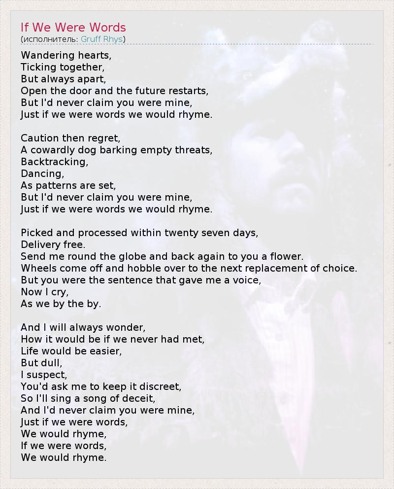 Wandering hearts, Ticking together, But always apart, Open the door and the future restarts, But I'd never claim you were mine, Just if we were words we would rhyme. Caution then regret, A cowardly dog barking empty threats, Backtracking, Dancing, As patterns are set, But I'd never claim you were mine, Just if we were words we would rhyme. Picked and processed within twenty seven days, Delivery free. Send me round the globe and back again to you a flower. Wheels come off and hobble over to the next replacement of choice. But you were the sentence that gave me a voice, Now I cry, As we by the by. And I will always wonder, How it would be if we never had met, Life would be easier, But dull, I suspect, You'd ask me to keep it discreet, So I'll sing a song of deceit, And I'd never claim you were mine, Just if we were words, We would rhyme, If we were words, We would rhyme.