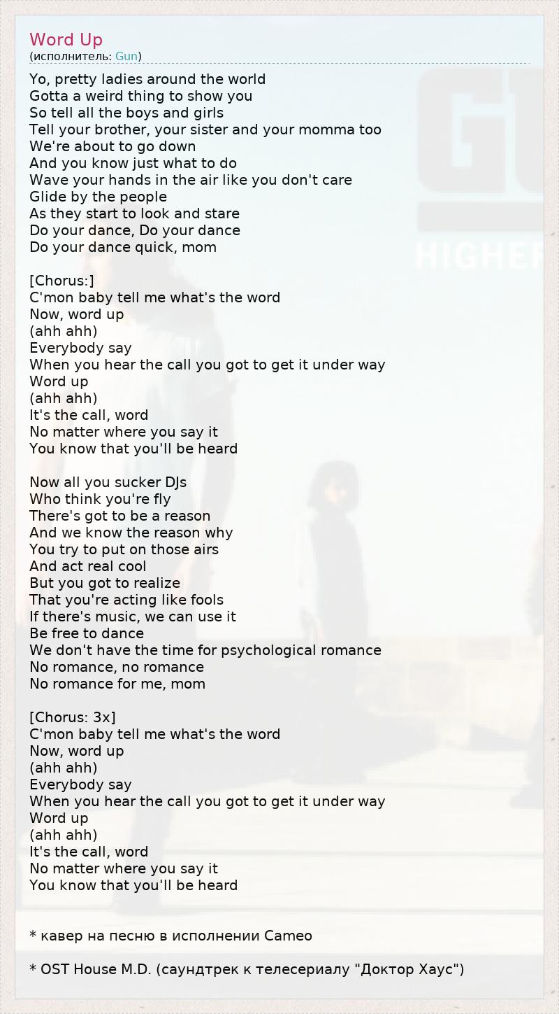 Yo, pretty ladies around the world Gotta a weird thing to show you So tell all the boys and girls Tell your brother, your sister and your momma too We're about to go down And you know just what to do Wave your hands in the air like you don't care Glide by the people As they start to look and stare Do your dance, Do your dance Do your dance quick, mom [Chorus:] C'mon baby tell me what's the word Now, word up (ahh ahh) Everybody say When you hear the call you got to get it under way Word up (ahh ahh) It's the call, word No matter where you say it You know that you'll be heard Now all you sucker DJs Who think you're fly There's got to be a reason And we know the reason why You try to put on those airs And act real cool But you got to realize That you're acting like fools If there's music, we can use it Be free to dance We don't have the time for psychological romance No romance, no romance No romance for me, mom [Chorus: 3х] C'mon baby tell me what's the word Now, word up (ahh ahh) Everybody say When you hear the call you got to get it under way Word up (ahh ahh) It's the call, word No matter where you say it You know that you'll be heard * кавер на песню в исполнении Cameo * OST House M.D. (саундтрек к телесериалу "Доктор Хаус")
