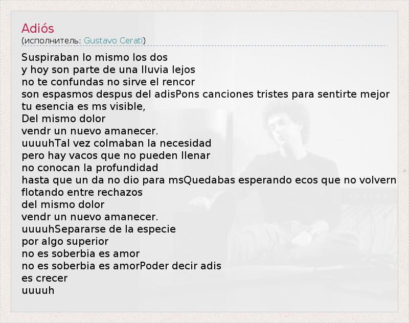 Это интересно:Gustavo Adrián Cerati Clark - Густаво Серати (родился в Буэнос-Айресе, 11 августа 1959 года). Аргентинский певец, композитор и гитарист. В 80-90-ые годы входил в состав известной аргентинской рок-группы Soda Stereo, вместе с Чарли Альберти (Charly Alberti) и Зета Босио (Zeta Bosio). После распада группы начал сольную карьеру с дебютным альбомом "Amor Amarillo" (в записи заглавного трека принял участие и Hector (Zeta)... продолжение
