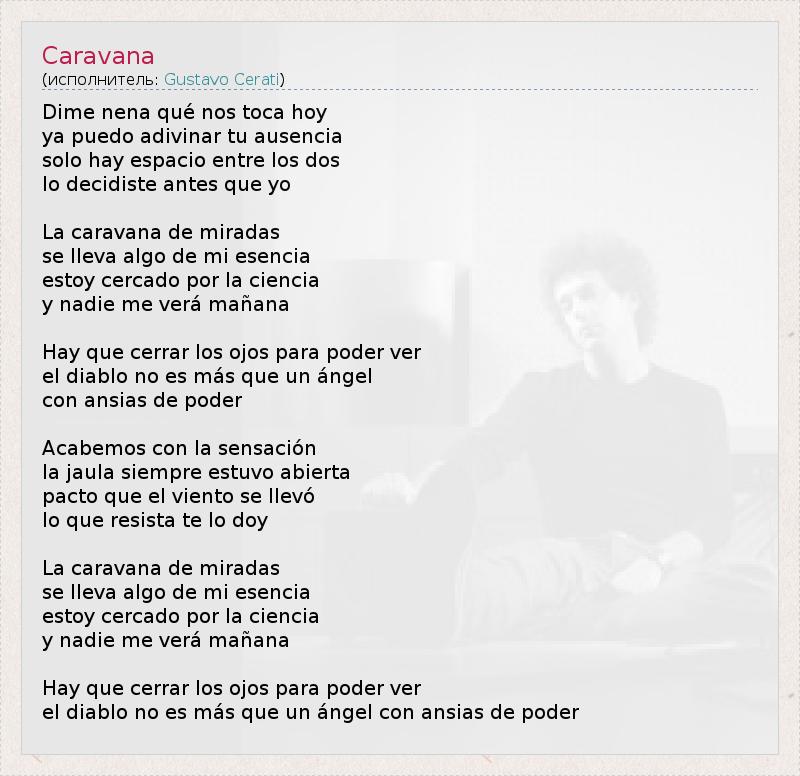 Это интересно:Gustavo Adrián Cerati Clark - Густаво Серати (родился в Буэнос-Айресе, 11 августа 1959 года). Аргентинский певец, композитор и гитарист. В 80-90-ые годы входил в состав известной аргентинской рок-группы Soda Stereo, вместе с Чарли Альберти (Charly Alberti) и Зета Босио (Zeta Bosio). После распада группы начал сольную карьеру с дебютным альбомом "Amor Amarillo" (в записи заглавного трека принял участие и Hector (Zeta)... продолжение