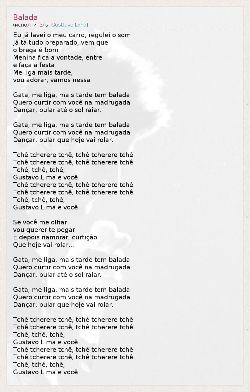 Это интересно:Густаву Лима (порт.-браз. Gusttavo Lima, настоящее имя Нивалду Батиста Лима, порт.-браз. Nivaldo Batista Lima, род. 3 сентября 1989, Президенти-Олегариу, Минас-Жерайс) — бразильский певец и автор песен.Всё начинается в 1998 году, когда в 9 лет Густаву впервые выступает в школьном хоре, исполняя песню É o Amor, написанную братьями Ди Камарго.В начале 2009 года выходит первый независимый альбом певца, Revelação. Ровно... продолжение
