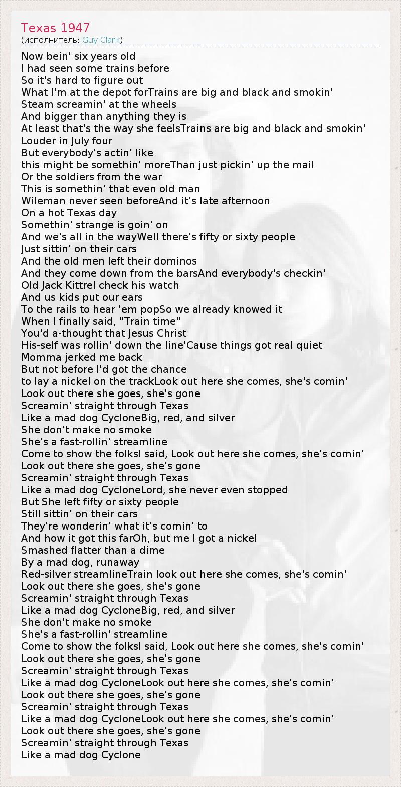 Now bein' six years old I had seen some trains before So it's hard to figure out What I'm at the depot forTrains are big and black and smokin' Steam screamin' at the wheels And bigger than anything they is At least that's the way she feelsTrains are big and black and smokin' Louder in July four But everybody's actin' like this might be somethin' moreThan just pickin' up the mail Or the soldiers from the war This is somethin' that even old man Wileman never seen beforeAnd it's late afternoon On a hot Texas day Somethin' strange is goin' on And we's all in the wayWell there's fifty or sixty people Just sittin' on their cars And the old men left their dominos And they come down from the barsAnd everybody's checkin' Old Jack Kittrel check his watch And us kids put our ears To the rails to hear 'em popSo we already knowed it When I finally said, "Train time" You'd a-thought that Jesus Christ His-self was rollin' down the line'Cause things got real quiet Momma jerked me back But not before I'd got the chance to lay a nickel on the trackLook out here she comes, she's comin' Look out there she goes, she's gone Screamin' straight through Texas Like a mad dog CycloneBig, red, and silver She don't make no smoke She's a fast-rollin' streamline Come to show the folksI said, Look out here she comes, she's comin' Look out there she goes, she's gone Screamin' straight through Texas Like a mad dog CycloneLord, she never even stopped But She left fifty or sixty people Still sittin' on their cars They're wonderin' what it's comin' to And how it got this farOh, but me I got a nickel Smashed flatter than a dime By a mad dog, runaway Red-silver streamlineTrain look out here she comes, she's comin' Look out there she goes, she's gone Screamin' straight through Texas Like a mad dog CycloneBig, red, and silver She don't make no smoke She's a fast-rollin' streamline Come to show the folksI said, Look out here she comes, she's comin' Look out there she goes, she's gone Screamin' straight through Texas Like a mad dog CycloneLook out here she comes, she's comin' Look out there she goes, she's gone Screamin' straight through Texas Like a mad dog CycloneLook out here she comes, she's comin' Look out there she goes, she's gone Screamin' straight through Texas Like a mad dog Cyclone
