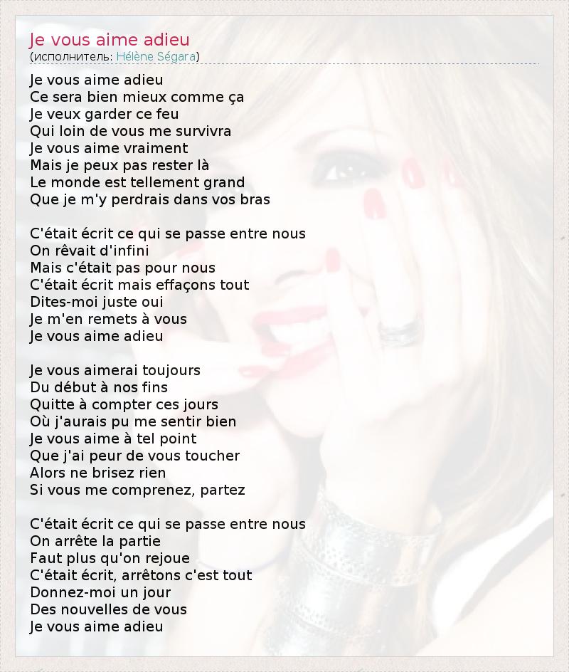 Я вас люблю, прощайте, Так будет гораздо лучше. Я хочу сберечь этот огонь, Который вдали от вас будет хранить меня. Я по-настоящему вас люблю, Но не могу остаться здесь. Мир так велик, Что я потерялась бы в ваших руках. Так и было суждено, то, что между нами. Мы мечтали о бесконечности, Но это было не для нас. Так было суждено, но давайте сотрём всё, Скажите мне да, Я полагаюсь на вас, Я вас люблю, прощайте. Я всегда буду вас любить, До самого конца, Ухожу, чтобы считать дни До момента, когда мне снова будет хорошо. Я вас люблю настолько, Что боюсь к вам прикоснуться, Так что не ломайте ничего, Если вы меня понимаете, уходите. Так и было суждено, то, что между нами. Мы прекращаем эту партию, Не нужно вновь её играть. Так было суждено, давайте остановимся, это всё. Сообщите мне когда-нибудь, Как вы. Я вас люблю, прощайте...
