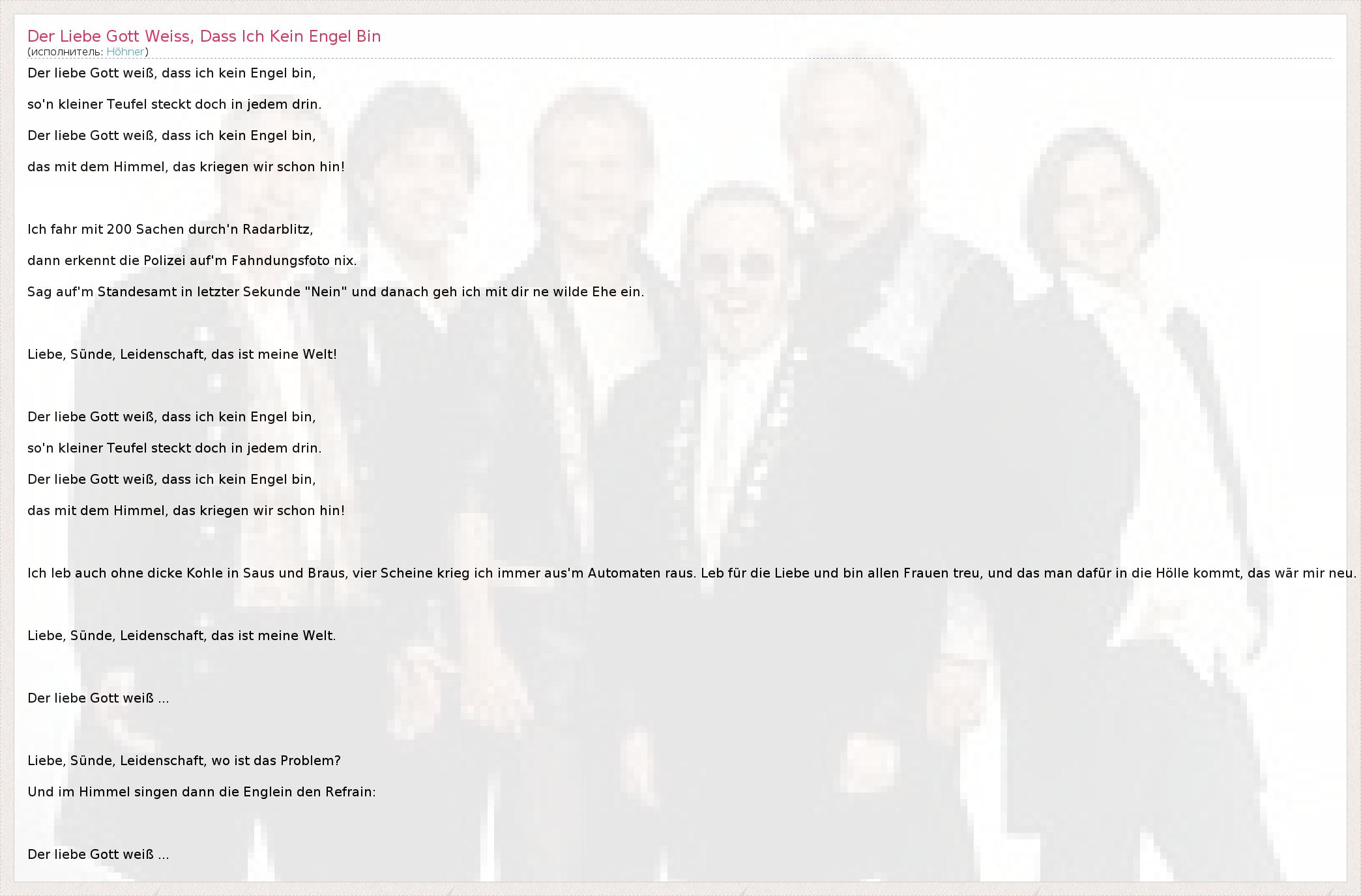 Der liebe Gott weiß, dass ich kein Engel bin, so'n kleiner Teufel steckt doch in jedem drin. Der liebe Gott weiß, dass ich kein Engel bin, das mit dem Himmel, das kriegen wir schon hin! Ich fahr mit 200 Sachen durch'n Radarblitz, dann erkennt die Polizei auf'm Fahndungsfoto nix. Sag auf'm Standesamt in letzter Sekunde "Nein" und danach geh ich mit dir ne wilde Ehe ein. Liebe, Sünde, Leidenschaft, das ist meine Welt! Der liebe Gott weiß, dass ich kein Engel bin, so'n kleiner Teufel steckt doch in jedem drin. Der liebe Gott weiß, dass ich kein Engel bin, das mit dem Himmel, das kriegen wir schon hin! Ich leb auch ohne dicke Kohle in Saus und Braus, vier Scheine krieg ich immer aus'm Automaten raus. Leb für die Liebe und bin allen Frauen treu, und das man dafür in die Hölle kommt, das wär mir neu. Liebe, Sünde, Leidenschaft, das ist meine Welt. Der liebe Gott weiß ... Liebe, Sünde, Leidenschaft, wo ist das Problem? Und im Himmel singen dann die Englein den Refrain: Der liebe Gott weiß ...