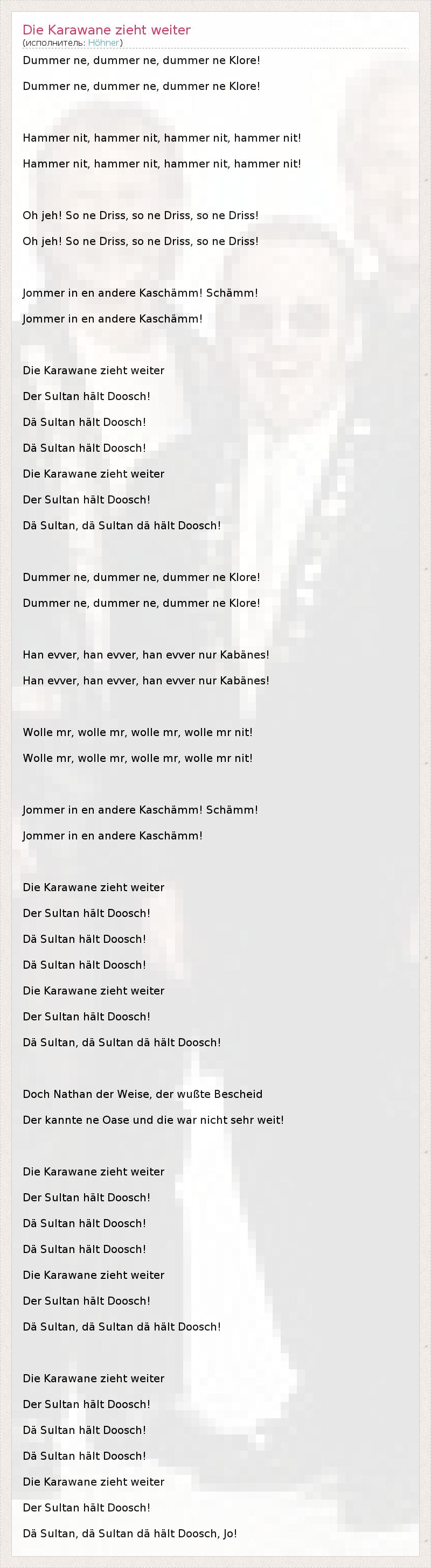 Dummer ne, dummer ne, dummer ne Klore! Dummer ne, dummer ne, dummer ne Klore! Hammer nit, hammer nit, hammer nit, hammer nit! Hammer nit, hammer nit, hammer nit, hammer nit! Oh jeh! So ne Driss, so ne Driss, so ne Driss! Oh jeh! So ne Driss, so ne Driss, so ne Driss! Jommer in en andere Kaschämm! Schämm! Jommer in en andere Kaschämm! Die Karawane zieht weiter Der Sultan hält Doosch! Dä Sultan hält Doosch! Dä Sultan hält Doosch! Die Karawane zieht weiter Der Sultan hält Doosch! Dä Sultan, dä Sultan dä hält Doosch! Dummer ne, dummer ne, dummer ne Klore! Dummer ne, dummer ne, dummer ne Klore! Han evver, han evver, han evver nur Kabänes! Han evver, han evver, han evver nur Kabänes! Wolle mr, wolle mr, wolle mr, wolle mr nit! Wolle mr, wolle mr, wolle mr, wolle mr nit! Jommer in en andere Kaschämm! Schämm! Jommer in en andere Kaschämm! Die Karawane zieht weiter Der Sultan hält Doosch! Dä Sultan hält Doosch! Dä Sultan hält Doosch! Die Karawane zieht weiter Der Sultan hält Doosch! Dä Sultan, dä Sultan dä hält Doosch! Doch Nathan der Weise, der wußte Bescheid Der kannte ne Oase und die war nicht sehr weit! Die Karawane zieht weiter Der Sultan hält Doosch! Dä Sultan hält Doosch! Dä Sultan hält Doosch! Die Karawane zieht weiter Der Sultan hält Doosch! Dä Sultan, dä Sultan dä hält Doosch! Die Karawane zieht weiter Der Sultan hält Doosch! Dä Sultan hält Doosch! Dä Sultan hält Doosch! Die Karawane zieht weiter Der Sultan hält Doosch! Dä Sultan, dä Sultan dä hält Doosch, Jo!