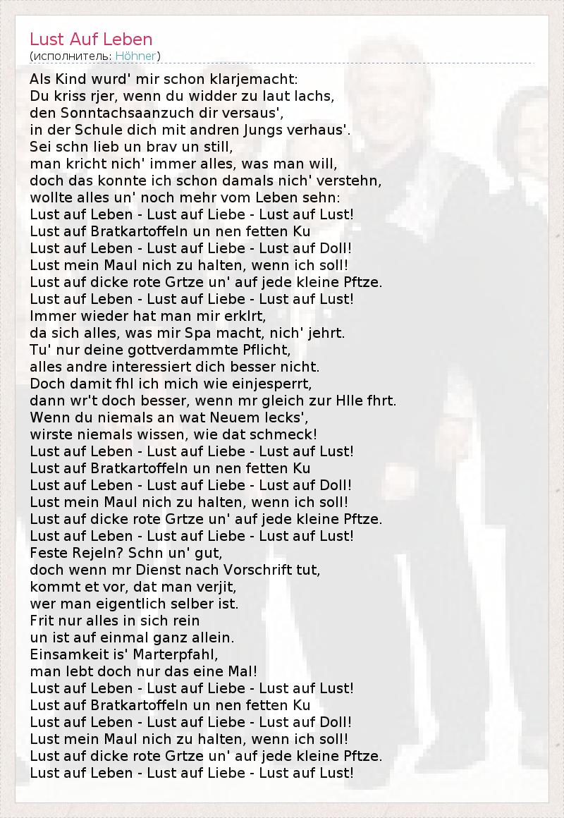 Als Kind wurd' mir schon klarjemacht: Du kriss rjer, wenn du widder zu laut lachs, den Sonntachsaanzuch dir versaus', in der Schule dich mit andren Jungs verhaus'. Sei schn lieb un brav un still, man kricht nich' immer alles, was man will, doch das konnte ich schon damals nich' verstehn, wollte alles un' noch mehr vom Leben sehn: Lust auf Leben - Lust auf Liebe - Lust auf Lust! Lust auf Bratkartoffeln un nen fetten Ku Lust auf Leben - Lust auf Liebe - Lust auf Doll! Lust mein Maul nich zu halten, wenn ich soll! Lust auf dicke rote Grtze un' auf jede kleine Pftze. Lust auf Leben - Lust auf Liebe - Lust auf Lust! Immer wieder hat man mir erklrt, da sich alles, was mir Spa macht, nich' jehrt. Tu' nur deine gottverdammte Pflicht, alles andre interessiert dich besser nicht. Doch damit fhl ich mich wie einjesperrt, dann wr't doch besser, wenn mr gleich zur Hlle fhrt. Wenn du niemals an wat Neuem lecks', wirste niemals wissen, wie dat schmeck! Lust auf Leben - Lust auf Liebe - Lust auf Lust! Lust auf Bratkartoffeln un nen fetten Ku Lust auf Leben - Lust auf Liebe - Lust auf Doll! Lust mein Maul nich zu halten, wenn ich soll! Lust auf dicke rote Grtze un' auf jede kleine Pftze. Lust auf Leben - Lust auf Liebe - Lust auf Lust! Feste Rejeln? Schn un' gut, doch wenn mr Dienst nach Vorschrift tut, kommt et vor, dat man verjit, wer man eigentlich selber ist. Frit nur alles in sich rein un ist auf einmal ganz allein. Einsamkeit is' Marterpfahl, man lebt doch nur das eine Mal! Lust auf Leben - Lust auf Liebe - Lust auf Lust! Lust auf Bratkartoffeln un nen fetten Ku Lust auf Leben - Lust auf Liebe - Lust auf Doll! Lust mein Maul nich zu halten, wenn ich soll! Lust auf dicke rote Grtze un' auf jede kleine Pftze. Lust auf Leben - Lust auf Liebe - Lust auf Lust!