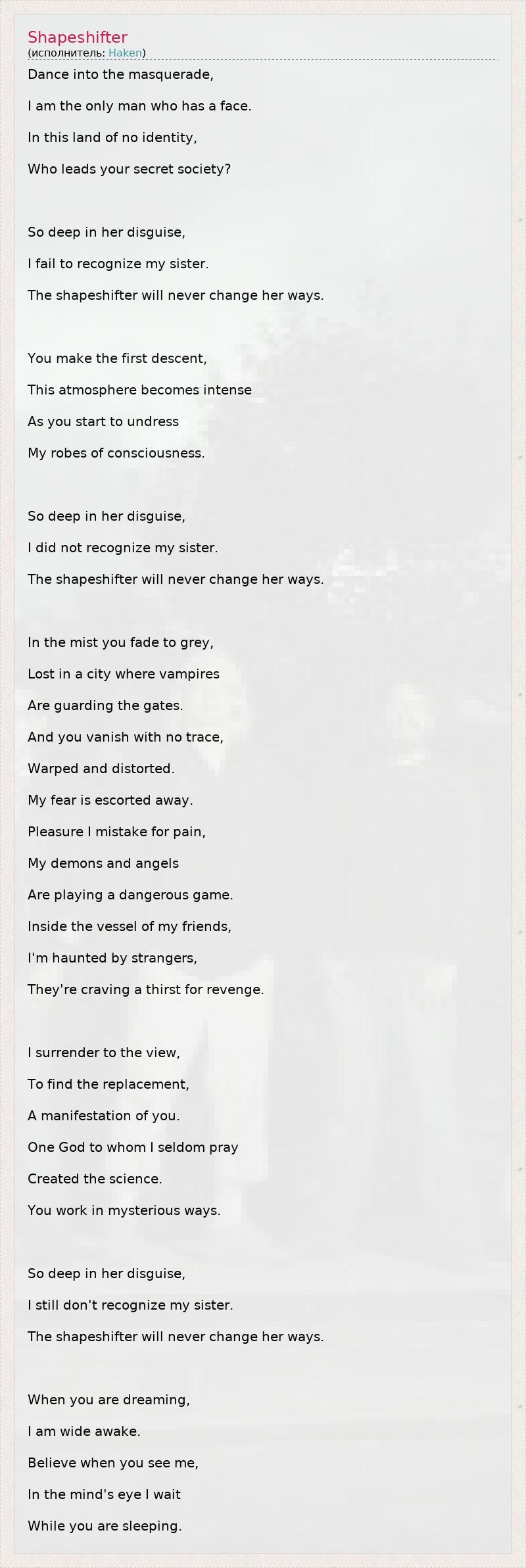 Dance into the masquerade, I am the only man who has a face. In this land of no identity, Who leads your secret society? So deep in her disguise, I fail to recognize my sister. The shapeshifter will never change her ways. You make the first descent, This atmosphere becomes intense As you start to undress My robes of consciousness. So deep in her disguise, I did not recognize my sister. The shapeshifter will never change her ways. In the mist you fade to grey, Lost in a city where vampires Are guarding the gates. And you vanish with no trace, Warped and distorted. My fear is escorted away. Pleasure I mistake for pain, My demons and angels Are playing a dangerous game. Inside the vessel of my friends, I'm haunted by strangers, They're craving a thirst for revenge. I surrender to the view, To find the replacement, A manifestation of you. One God to whom I seldom pray Created the science. You work in mysterious ways. So deep in her disguise, I still don't recognize my sister. The shapeshifter will never change her ways. When you are dreaming, I am wide awake. Believe when you see me, In the mind's eye I wait While you are sleeping.