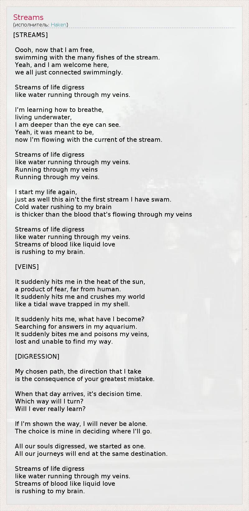 [STREAMS] Oooh, now that I am free, swimming with the many fishes of the stream. Yeah, and I am welcome here, we all just connected swimmingly. Streams of life digress like water running through my veins. I'm learning how to breathe, living underwater, I am deeper than the eye can see. Yeah, it was meant to be, now I'm flowing with the current of the stream. Streams of life digress like water running through my veins. Running through my veins Running through my veins. I start my life again, just as well this ain't the first stream I have swam. Cold water rushing to my brain is thicker than the blood that's flowing through my veins Streams of life digress like water running through my veins. Streams of blood like liquid love is rushing to my brain. [VEINS] It suddenly hits me in the heat of the sun, a product of fear, far from human. It suddenly hits me and crushes my world like a tidal wave trapped in my shell. It suddenly hits me, what have I become? Searching for answers in my aquarium. It suddenly bites me and poisons my veins, lost and unable to find my way. [DIGRESSION] My chosen path, the direction that I take is the consequence of your greatest mistake. When that day arrives, it's decision time. Which way will I turn? Will I ever really learn? If I'm shown the way, I will never be alone. The choice is mine in deciding where I'll go. All our souls digressed, we started as one. All our journeys will end at the same destination. Streams of life digress like water running through my veins. Streams of blood like liquid love is rushing to my brain.