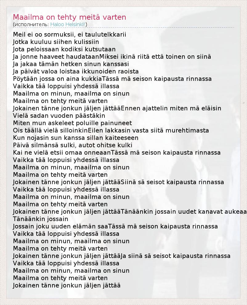 ГлавнаяИсполнителиHaloo Helsinki!Maailma on tehty meitä varten