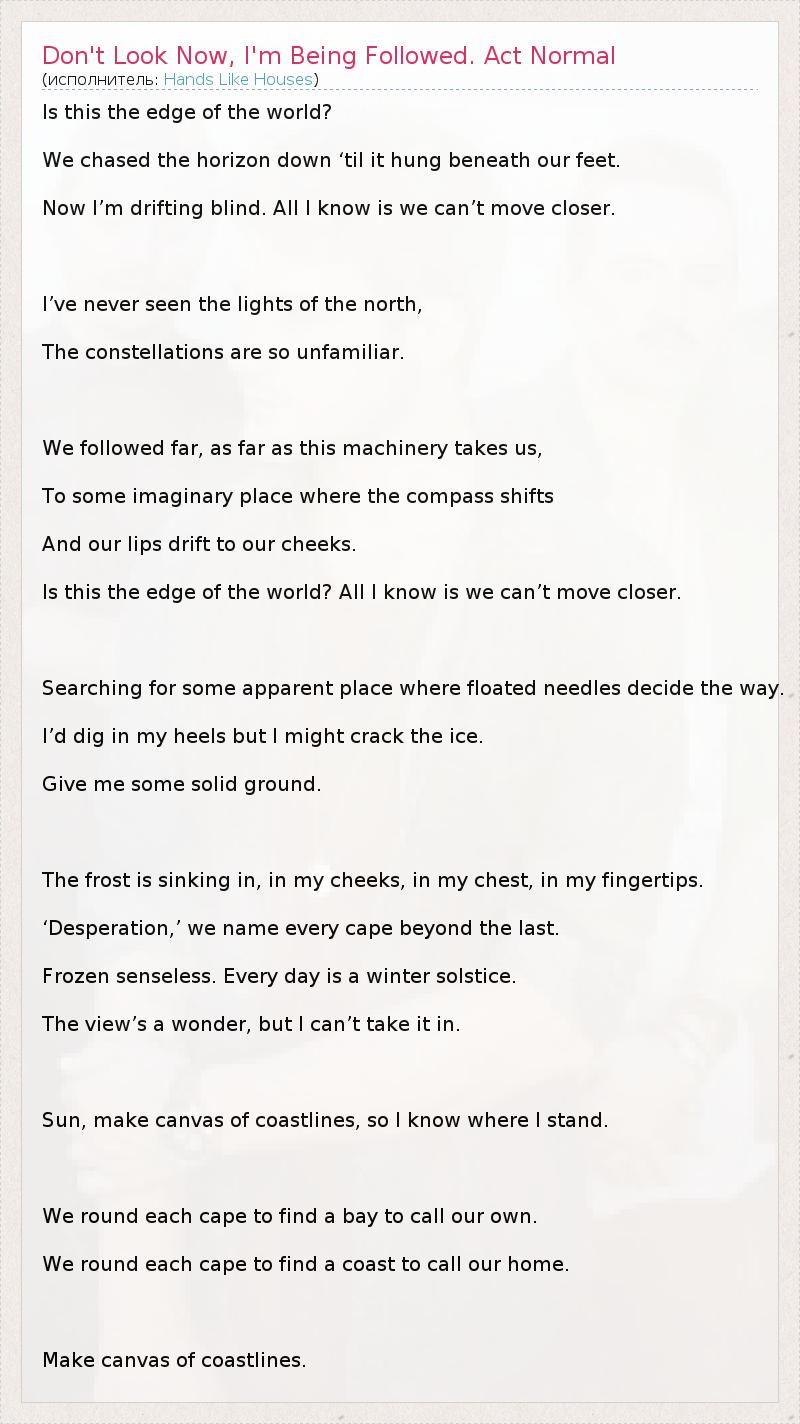 А как ты думаешь, о чем песня "Don't Look Now, I'm Being Followed. Act Normal" ?