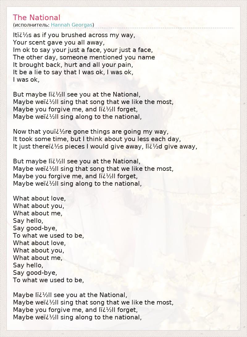 It�s as if you brushed across my way, Your scent gave you all away, Im ok to say your just a face, your just a face, The other day, someone mentioned you name It brought back, hurt and all your pain, It be a lie to say that I was ok, I was ok, I was ok, But maybe I�ll see you at the National, Maybe we�ll sing that song that we like the most, Maybe you forgive me, and I�ll forget, Maybe we�ll sing along to the national, Now that you�re gone things are going my way, It took some time, but I think about you less each day, It just there�s pieces I would give away, I�d give away, But maybe I�ll see you at the National, Maybe we�ll sing that song that we like the most, Maybe you forgive me, and I�ll forget, Maybe we�ll sing along to the national, What about love, What about you, What about me, Say hello, Say good-bye, To what we used to be, What about love, What about you, What about me, Say hello, Say good-bye, To what we used to be, Maybe I�ll see you at the National, Maybe we�ll sing that song that we like the most, Maybe you forgive me, and I�ll forget, Maybe we�ll sing along to the national,