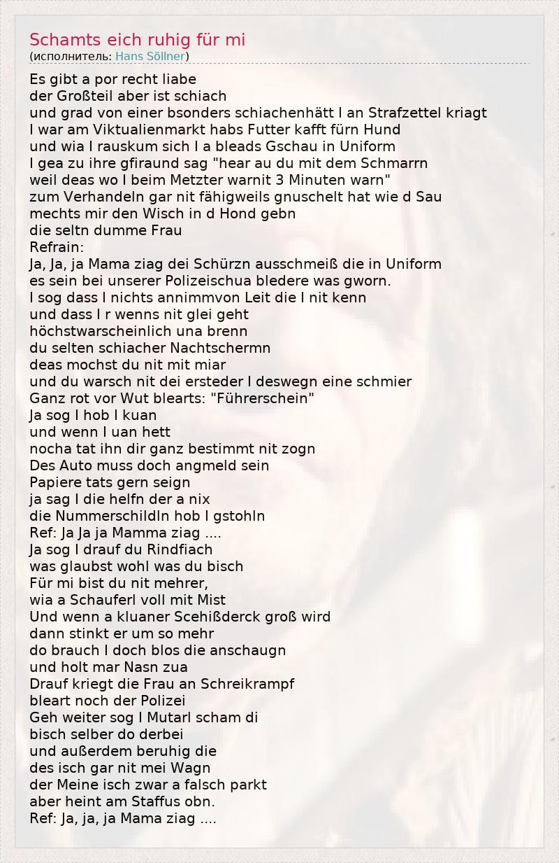 Es gibt a por recht liabe der Großteil aber ist schiach und grad von einer bsonders schiachenhätt I an Strafzettel kriagt I war am Viktualienmarkt habs Futter kafft fürn Hund und wia I rauskum sich I a bleads Gschau in Uniform I gea zu ihre gfiraund sag "hear au du mit dem Schmarrn weil deas wo I beim Metzter warnit 3 Minuten warn" zum Verhandeln gar nit fähigweils gnuschelt hat wie d Sau mechts mir den Wisch in d Hond gebn die seltn dumme Frau Refrain: Ja, Ja, ja Mama ziag dei Schürzn ausschmeiß die in Uniform es sein bei unserer Polizeischua bledere was gworn. I sog dass I nichts annimmvon Leit die I nit kenn und dass I r wenns nit glei geht höchstwarscheinlich una brenn du selten schiacher Nachtschermn deas mochst du nit mit miar und du warsch nit dei ersteder I deswegn eine schmier Ganz rot vor Wut blearts: "Führerschein" Ja sog I hob I kuan und wenn I uan hett nocha tat ihn dir ganz bestimmt nit zogn Des Auto muss doch angmeld sein Papiere tats gern seign ja sag I die helfn der a nix die Nummerschildln hob I gstohln Ref: Ja Ja ja Mamma ziag .... Ja sog I drauf du Rindfiach was glaubst wohl was du bisch Für mi bist du nit mehrer, wia a Schauferl voll mit Mist Und wenn a kluaner Scehißderck groß wird dann stinkt er um so mehr do brauch I doch blos die anschaugn und holt mar Nasn zua Drauf kriegt die Frau an Schreikrampf bleart noch der Polizei Geh weiter sog I Mutarl scham di bisch selber do derbei und außerdem beruhig die des isch gar nit mei Wagn der Meine isch zwar a falsch parkt aber heint am Staffus obn. Ref: Ja, ja, ja Mama ziag ....