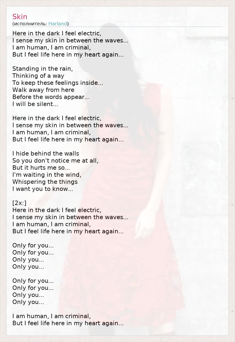 Here in the dark I feel electric, I sense my skin in between the waves... I am human, I am criminal, But I feel life here in my heart again... Standing in the rain, Thinking of a way To keep these feelings inside... Walk away from here Before the words appear... I will be silent... Here in the dark I feel electric, I sense my skin in between the waves... I am human, I am criminal, But I feel life here in my heart again... I hide behind the walls So you don't notice me at all, But it hurts me so... I'm waiting in the wind, Whispering the things I want you to know... [2x:] Here in the dark I feel electric, I sense my skin in between the waves... I am human, I am criminal, But I feel life here in my heart again... Only for you... Only for you... Only you... Only you... Only for you... Only for you... Only you... Only you... I am human, I am criminal, But I feel life here in my heart again...