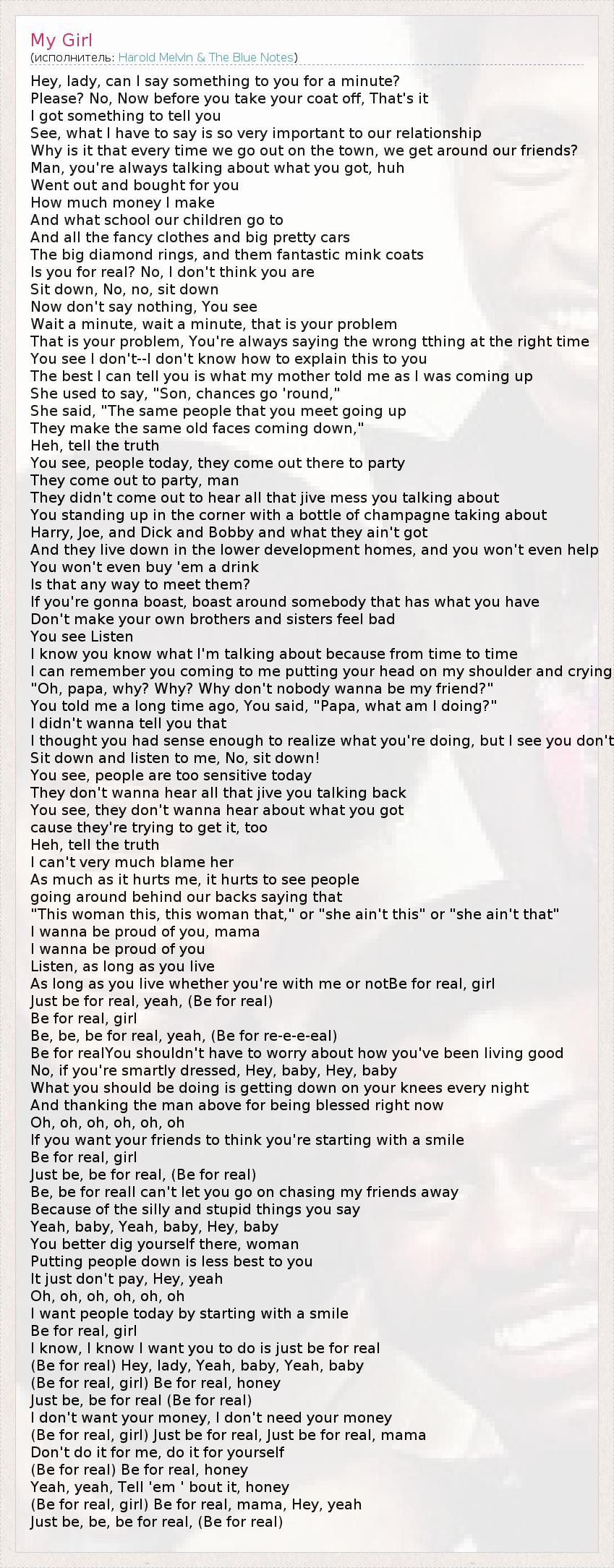 Hey, lady, can I say something to you for a minute? Please? No, Now before you take your coat off, That's it I got something to tell you See, what I have to say is so very important to our relationship Why is it that every time we go out on the town, we get around our friends? Man, you're always talking about what you got, huh Went out and bought for you How much money I make And what school our children go to And all the fancy clothes and big pretty cars The big diamond rings, and them fantastic mink coats Is you for real? No, I don't think you are Sit down, No, no, sit down Now don't say nothing, You see Wait a minute, wait a minute, that is your problem That is your problem, You're always saying the wrong tthing at the right time You see I don't--I don't know how to explain this to you The best I can tell you is what my mother told me as I was coming up She used to say, "Son, chances go 'round," She said, "The same people that you meet going up They make the same old faces coming down," Heh, tell the truth You see, people today, they come out there to party They come out to party, man They didn't come out to hear all that jive mess you talking about You standing up in the corner with a bottle of champagne taking about Harry, Joe, and Dick and Bobby and what they ain't got And they live down in the lower development homes, and you won't even help You won't even buy 'em a drink Is that any way to meet them? If you're gonna boast, boast around somebody that has what you have Don't make your own brothers and sisters feel bad You see Listen I know you know what I'm talking about because from time to time I can remember you coming to me putting your head on my shoulder and crying "Oh, papa, why? Why? Why don't nobody wanna be my friend?" You told me a long time ago, You said, "Papa, what am I doing?" I didn't wanna tell you that I thought you had sense enough to realize what you're doing, but I see you don't Sit down and listen to me, No, sit down! You see, people are too sensitive today They don't wanna hear all that jive you talking back You see, they don't wanna hear about what you got cause they're trying to get it, too Heh, tell the truth I can't very much blame her As much as it hurts me, it hurts to see people going around behind our backs saying that "This woman this, this woman that," or "she ain't this" or "she ain't that" I wanna be proud of you, mama I wanna be proud of you Listen, as long as you live As long as you live whether you're with me or notBe for real, girl Just be for real, yeah, (Be for real) Be for real, girl Be, be, be for real, yeah, (Be for re-e-e-eal) Be for realYou shouldn't have to worry about how you've been living good No, if you're smartly dressed, Hey, baby, Hey, baby What you should be doing is getting down on your knees every night And thanking the man above for being blessed right now Oh, oh, oh, oh, oh, oh If you want your friends to think you're starting with a smile Be for real, girl Just be, be for real, (Be for real) Be, be for realI can't let you go on chasing my friends away Because of the silly and stupid things you say Yeah, baby, Yeah, baby, Hey, baby You better dig yourself there, woman Putting people down is less best to you It just don't pay, Hey, yeah Oh, oh, oh, oh, oh, oh I want people today by starting with a smile Be for real, girl I know, I know I want you to do is just be for real (Be for real) Hey, lady, Yeah, baby, Yeah, baby (Be for real, girl) Be for real, honey Just be, be for real (Be for real) I don't want your money, I don't need your money (Be for real, girl) Just be for real, Just be for real, mama Don't do it for me, do it for yourself (Be for real) Be for real, honey Yeah, yeah, Tell 'em ' bout it, honey (Be for real, girl) Be for real, mama, Hey, yeah Just be, be, be for real, (Be for real)