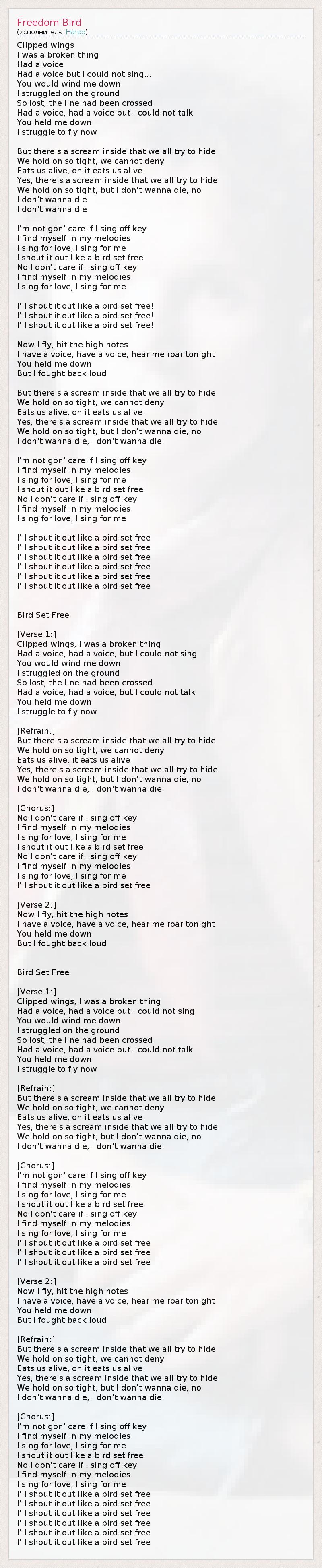 С отрезанными крыльями, Я была абсолютно беспомощной, У меня был голос, Был голос - но я не могла петь... Ты бы мог успокоить меня, Пока я пыталась выжить на земле, Совсем одна; черта уже проведена. У меня был голос, был голос, но я не могла говорить. Ты взял меня в плен, И теперь мне тяжело летать. Но внутри нас крик, который все мы стараемся скрыть. Мы держимся друг за друга так крепко, мы не отрицаем этого, Это съедает нас живьем, о, съедает нас живьем, Да, внутри нас крик, который все мы стараемся скрыть. Мы держимся друг за друга так крепко, но я не хочу умирать, нет, Я не хочу умирать, Я не хочу умирать. Мне все равно, если я спою мимо нот, Я нахожу себя в своих мелодиях, Я пою для любви, я пою для себя самой, Я выкрикиваю это, как птица, освободившаяся от пут, Нет, мне будет все равно, если я спою мимо нот, Я нахожу себя в своих мелодиях, Я пою для любви, я пою для себя самой. Я выкрикну это, как птица, освободившаяся от пут, Я выкрикну это, как птица, освободившаяся от пут, Я выкрикну это, как птица, освободившаяся от пут. А теперь я летаю, могу петь высокие ноты, У меня есть голос, у меня есть голос - слушай, как я буду рычать сегодня, Ты взял меня в плен, Но я сражалась так отчаянно! Но внутри нас крик, который все мы стараемся скрыть. Мы держимся друг за друга так крепко, мы не отрицаем этого, Это съедает нас живьем, о, съедает живьем, Да, внутри нас крик, который все мы стараемся скрыть. Мы держимся друг за друга так крепко, но я не хочу умирать, нет, Я не хочу умирать, не хочу умирать. Мне все равно, если я спою мимо нот, Я нахожу себя в своих мелодиях, Я пою для любви, я пою для себя самой, Я выкрикиваю это, как птица, освободившаяся от пут, Нет, мне все равно, если я спою мимо нот, Я нахожу себя в своих мелодиях, Я пою для любви, я пою для себя самой. Я выкрикну это, как птица, освободившаяся от пут. Я выкрикну это, как птица, освободившаяся от пут. Я выкрикну это, как птица, освободившаяся от пут. Я выкрикну это, как птица, освободившаяся от пут. Я выкрикну это, как птица, освободившаяся от пут. Я выкрикну это, как птица, освободившаяся от пут. Освобождающаяся птица (перевод Никита из Тулы) [Куплет 1:] Мне отрезали крылья и выбросили, словно поломанную вещь. У меня был голос, но какой толк, если я не могла петь? Вы хотели столкнуть меня вниз, Но я боролась и крепко стояла на земле. Рядом никого не оставалось, пути назад уже не было; У меня был голос, но я не могла сказать ни слова. Вы удерживали меня всеми силами, Но я боролась, чтобы смочь взлететь. [Припев:] Но внутри нас есть крик, который мы все пытаемся скрыть. Мы продолжаем делать это настолько усердно, что нельзя отрицать: Он пожирает нас, пока мы живём. Да, мы скрываем крик, живущий внутри нас. Мы продолжаем делать это так усердно, но я не хочу умирать, нет, Я не хочу умирать из-за этого паразита внутри. [Припев:] Мне плевать, если я не попадаю в ноты, Ибо я нахожу себя в своих мелодиях, И я пою их лишь для любви и для себя самой. Я выкрикиваю их, как птица, вырывающаяся на свободу. Мне плевать, если я не попадаю в ноты, Ибо я нахожу себя в своих мелодиях, И я пою их лишь для любви и для себя самой. Я выкрикиваю их, словно птица, летящая на свободу. [Куплет 2:] Теперь я лечу, выкрикивая высокие ноты. У меня есть голос! У меня есть голос, так услышьте мой рёв сегодня ночью! Вы удерживали меня всеми силами, Но криком я смогла дать вам отпор. Птица, выпущенная на 