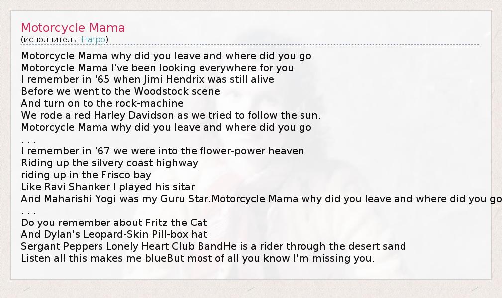 А как ты думаешь, о чем песня "Motorcycle Mama" ?