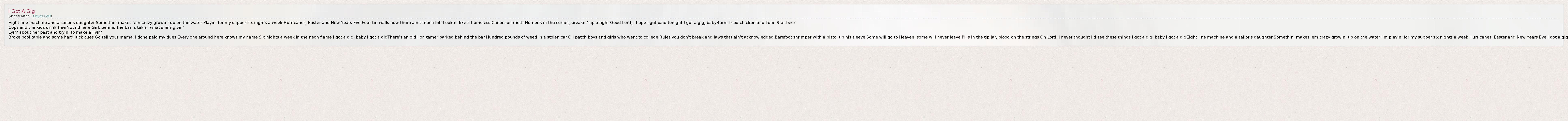 Eight line machine and a sailor's daughter Somethin' makes 'em crazy growin' up on the water Playin' for my supper six nights a week Hurricanes, Easter and New Years Eve Four tin walls now there ain't much left Lookin' like a homeless Cheers on meth Homer's in the corner, breakin' up a fight Good Lord, I hope I get paid tonight I got a gig, babyBurnt fried chicken and Lone Star beer Cops and the kids drink free 'round here Girl, behind the bar is takin' what she's givin' Lyin' about her past and tryin' to make a livin' Broke pool table and some hard luck cues Go tell your mama, I done paid my dues Every one around here knows my name Six nights a week in the neon flame I got a gig, baby I got a gigThere's an old lion tamer parked behind the bar Hundred pounds of weed in a stolen car Oil patch boys and girls who went to college Rules you don't break and laws that ain't acknowledged Barefoot shrimper with a pistol up his sleeve Some will go to Heaven, some will never leave Pills in the tip jar, blood on the strings Oh Lord, I never thought I'd see these things I got a gig, baby I got a gigEight line machine and a sailor's daughter Somethin' makes 'em crazy growin' up on the water I'm playin' for my supper six nights a week Hurricanes, Easter and New Years Eve I got a gig