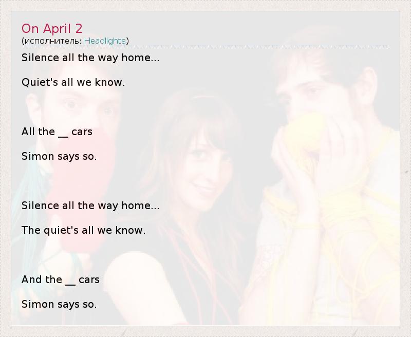 Silence all the way home... Quiet's all we know. All the __ cars Simon says so. Silence all the way home... The quiet's all we know. And the __ cars Simon says so.