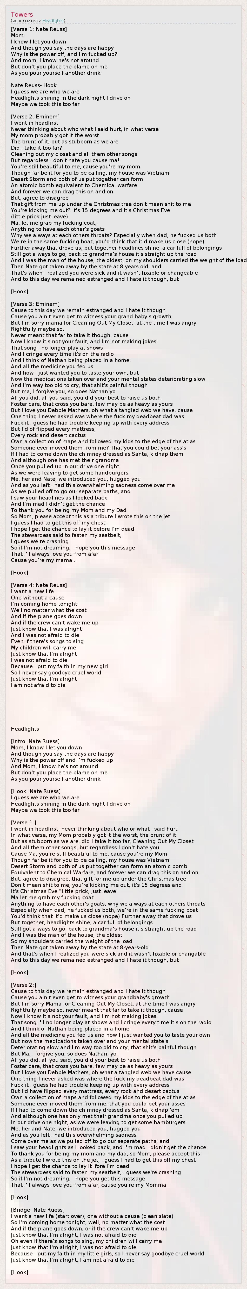 [Verse 1: Nate Reuss] Mom I know I let you down And though you say the days are happy Why is the power off, and I'm fucked up? And mom, I know he's not around But don't you place the blame on me As you pour yourself another drink Nate Reuss- Hook I guess we are who we are Headlights shining in the dark night I drive on Maybe we took this too far [Verse 2: Eminem] I went in headfirst Never thinking about who what I said hurt, in what verse My mom probably got it the worst The brunt of it, but as stubborn as we are Did I take it too far? Cleaning out my closet and all them other songs But regardless I don't hate you cause ma! You're still beautiful to me, cause you're my mom Though far be it for you to be calling, my house was Vietnam Desert Storm and both of us put together can form An atomic bomb equivalent to Chemical warfare And forever we can drag this on and on But, agree to disagree That gift from me up under the Christmas tree don't mean shit to me You're kicking me out? It's 15 degrees and it's Christmas Eve (little prick just leave) Ma, let me grab my fucking coat, Anything to have each other's goats Why we always at each others throats? Especially when dad, he fucked us both We're in the same fucking boat, you'd think that it'd make us close (nope) Further away that drove us, but together headlines shine, a car full of belongings Still got a ways to go, back to grandma's house it's straight up the road And I was the man of the house, the oldest, on my shoulders carried the weight of the load Then Nate got taken away by the state at 8 years old, and That's when I realized you were sick and it wasn't fixable or changeable And to this day we remained estranged and I hate it though, but [Hook] [Verse 3: Eminem] Cause to this day we remain estranged and I hate it though Cause you ain't even get to witness your grand baby's growth But I'm sorry mama for Cleaning Out My Closet, at the time I was angry Rightfully maybe so, Never meant that far to take it though, cause Now I know it's not your fault, and I'm not making jokes That song I no longer play at shows And I cringe every time it's on the radio And I think of Nathan being placed in a home And all the medicine you fed us And how I just wanted you to taste your own, but Now the medications taken over and your mental states deteriorating slow And I'm way too old to cry, that shit's painful though But ma, I forgive you, so does Nathan yo All you did, all you said, you did your best to raise us both Foster care, that cross you bare, few may be as heavy as yours But I love you Debbie Mathers, oh what a tangled web we have, cause One thing I never asked was where the fuck my deadbeat dad was Fuck it I guess he had trouble keeping up with every address But I'd of flipped every mattress, Every rock and desert cactus Own a collection of maps and followed my kids to the edge of the atlas Someone ever moved them from me? That you could bet your ass's If I had to come down the chimney dressed as Santa, kidnap them And although one has met their grandma Once you pulled up in our drive one night As we were leaving to get some handburgers Me, her and Nate, we introduced you, hugged you And as you left I had this overwhelming sadness come over me As we pulled off to go our separate paths, and I saw your headlines as I looked back And I'm mad I didn't get the chance To thank you for being my Mom and my Dad So Mom, please accept this as a tribute I wrote this on the jet I guess I had to get this off my chest, I hope I get the chance to lay it before I'm dead The stewardess said to fasten my seatbelt, I guess we're crashing So if I'm not dreaming, I hope you this message That I'll always love you from afar Cause you're my mama... [Hook] [Verse 4: Nate Reuss] I want a new life One without a cause I'm coming home tonight Well no matter what the cost And if the plane goes down And if the crew can't wake me up Just know that I was alright And I was not afraid to die Even if there's songs to sing My children will carry me Just know that I'm alright I was not afraid to die Because I put my faith in my new girl So I never say goodbye cruel world Just know that I'm alright I am not afraid to die Headlights [Intro: Nate Ruess] Mom, I know I let you down And though you say the days are happy Why is the power off and I'm fucked up And Mom, I know he's not around But don't you place the blame on me As you pour yourself another drink [Hook: Nate Ruess] I guess we are who we are Headlights shining in the dark night I drive on Maybe we took this too far [Verse 1:] I went in headfirst, never thinking about who or what I said hurt In what verse, my Mom probably got it the worst, the brunt of it But as stubborn as we are, did I take it too far, Cleaning Out My Closet And all them other songs, but regardless I don't hate you Cause Ma, you're still beautiful to me, cause you're my Mom Though far be it for you to be calling, my house was Vietnam Desert Storm and both of us put together can form an atomic bomb Equivalent to Chemical Warfare, and forever we can drag this on and on But, agree to disagree, that gift for me up under the Christmas tree Don't mean shit to me, you're kicking me out, it's 15 degrees and It's Christmas Eve "little prick, just leave" Ma let me grab my fucking coat Anything to have each other's goats, why we always at each others throats Especially when dad, he fucked us both, we're in the same fucking boat You'd think that it'd make us close (nope) Further away that drove us But together, headlights shine, a car full of belongings Still got a ways to go, back to grandma's house it's straight up the road And I was the man of the house, the oldest So my shoulders carried the weight of the load Then Nate got taken away by the state at 8-years-old And that's when I realized you were sick and it wasn't fixable or changable And to this day we remained estranged and I hate it though, but [Hook] [Verse 2:] Cause to this day we remain estranged and I hate i