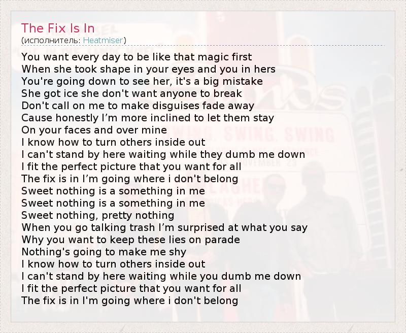 You want every day to be like that magic first When she took shape in your eyes and you in hers You're going down to see her, it's a big mistake She got ice she don't want anyone to break Don't call on me to make disguises fade away Cause honestly I’m more inclined to let them stay On your faces and over mine I know how to turn others inside out I can't stand by here waiting while they dumb me down I fit the perfect picture that you want for all The fix is in I’m going where i don't belong Sweet nothing is a something in me Sweet nothing is a something in me Sweet nothing, pretty nothing When you go talking trash I’m surprised at what you say Why you want to keep these lies on parade Nothing's going to make me shy I know how to turn others inside out I can't stand by here waiting while you dumb me down I fit the perfect picture that you want for all The fix is in I'm going where i don't belong