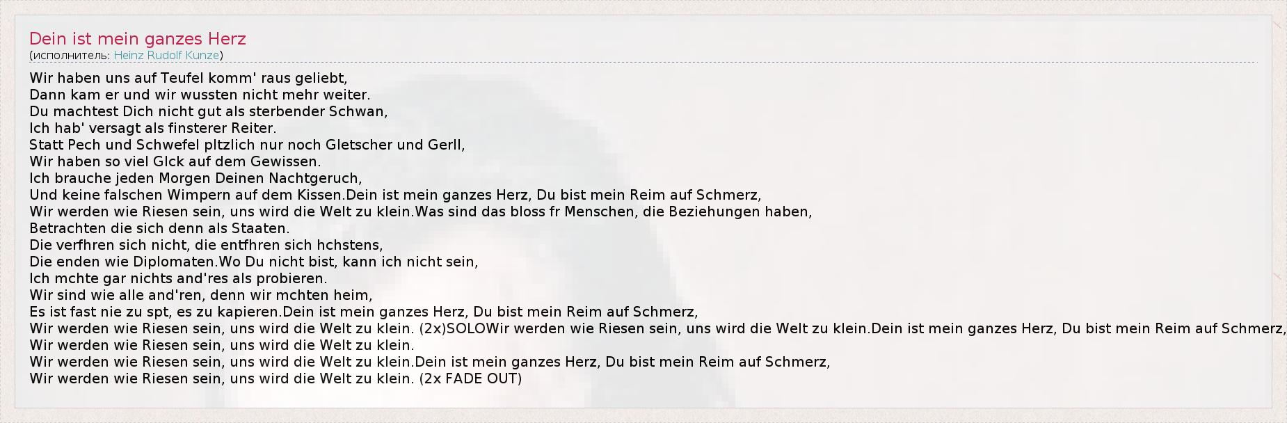 Wir haben uns auf Teufel komm' raus geliebt, Dann kam er und wir wussten nicht mehr weiter. Du machtest Dich nicht gut als sterbender Schwan, Ich hab' versagt als finsterer Reiter. Statt Pech und Schwefel pltzlich nur noch Gletscher und Gerll, Wir haben so viel Glck auf dem Gewissen. Ich brauche jeden Morgen Deinen Nachtgeruch, Und keine falschen Wimpern auf dem Kissen.Dein ist mein ganzes Herz, Du bist mein Reim auf Schmerz, Wir werden wie Riesen sein, uns wird die Welt zu klein.Was sind das bloss fr Menschen, die Beziehungen haben, Betrachten die sich denn als Staaten. Die verfhren sich nicht, die entfhren sich hchstens, Die enden wie Diplomaten.Wo Du nicht bist, kann ich nicht sein, Ich mchte gar nichts and'res als probieren. Wir sind wie alle and'ren, denn wir mchten heim, Es ist fast nie zu spt, es zu kapieren.Dein ist mein ganzes Herz, Du bist mein Reim auf Schmerz, Wir werden wie Riesen sein, uns wird die Welt zu klein. (2x)SOLOWir werden wie Riesen sein, uns wird die Welt zu klein.Dein ist mein ganzes Herz, Du bist mein Reim auf Schmerz, Wir werden wie Riesen sein, uns wird die Welt zu klein. Wir werden wie Riesen sein, uns wird die Welt zu klein.Dein ist mein ganzes Herz, Du bist mein Reim auf Schmerz, Wir werden wie Riesen sein, uns wird die Welt zu klein. (2x FADE OUT)