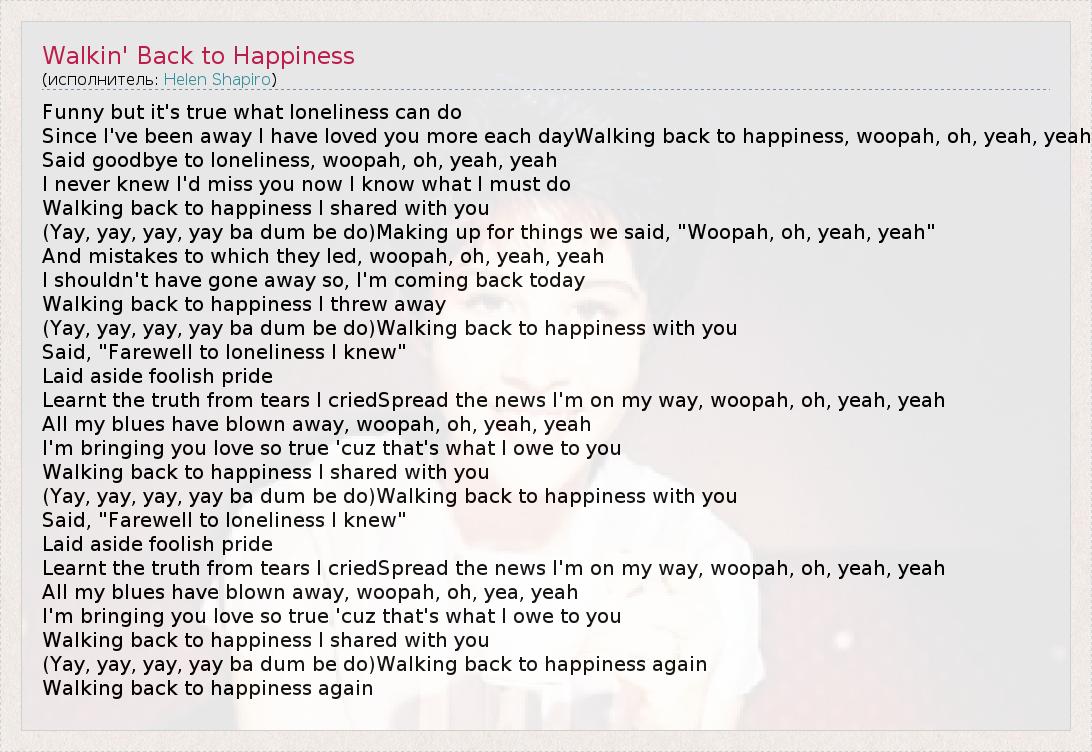 А как ты думаешь, о чем песня "Walkin' Back to Happiness" ?